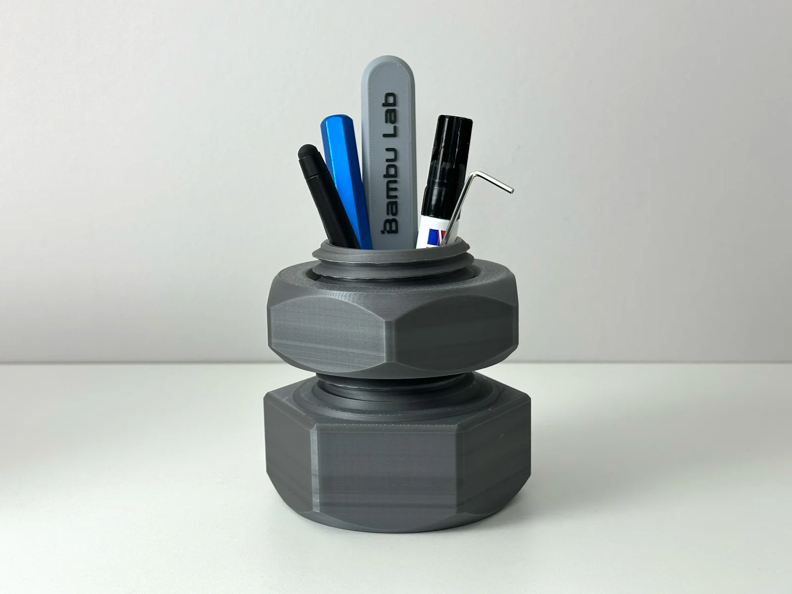 Một chiếc cup / vase đa dụng, được tạo hình theo một con bulông đầu lục giác M64 kèm theo đai ốc vừa khít. Trang trí “chuẩn maker” cho góc làm việc của bạn! Phần vít và đai ốc là 2 món tách rời và vặn được hoàn toàn, cũng rất hợp để làm đồ chơi fidget.