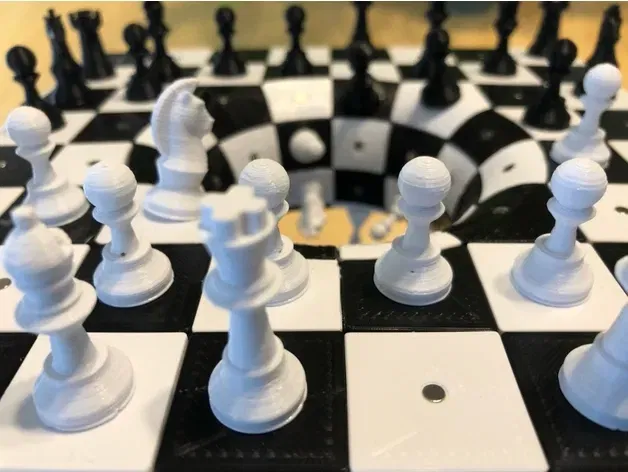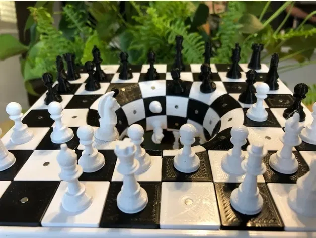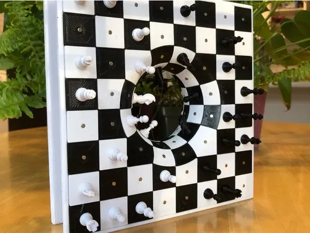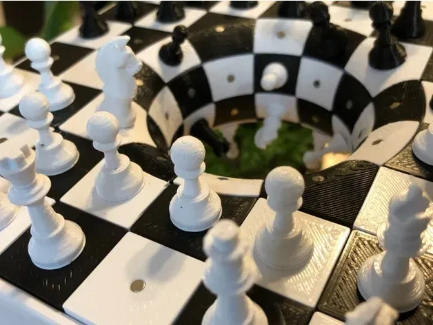 Bàn cờ “Wormhole Chess Board” này được tạo thành từ hai bàn cờ cỡ thường đặt lưng vào nhau, được kết nối bởi một bề mặt catenoid thông qua lưới 4 x 4 ở giữa mỗi bàn.
