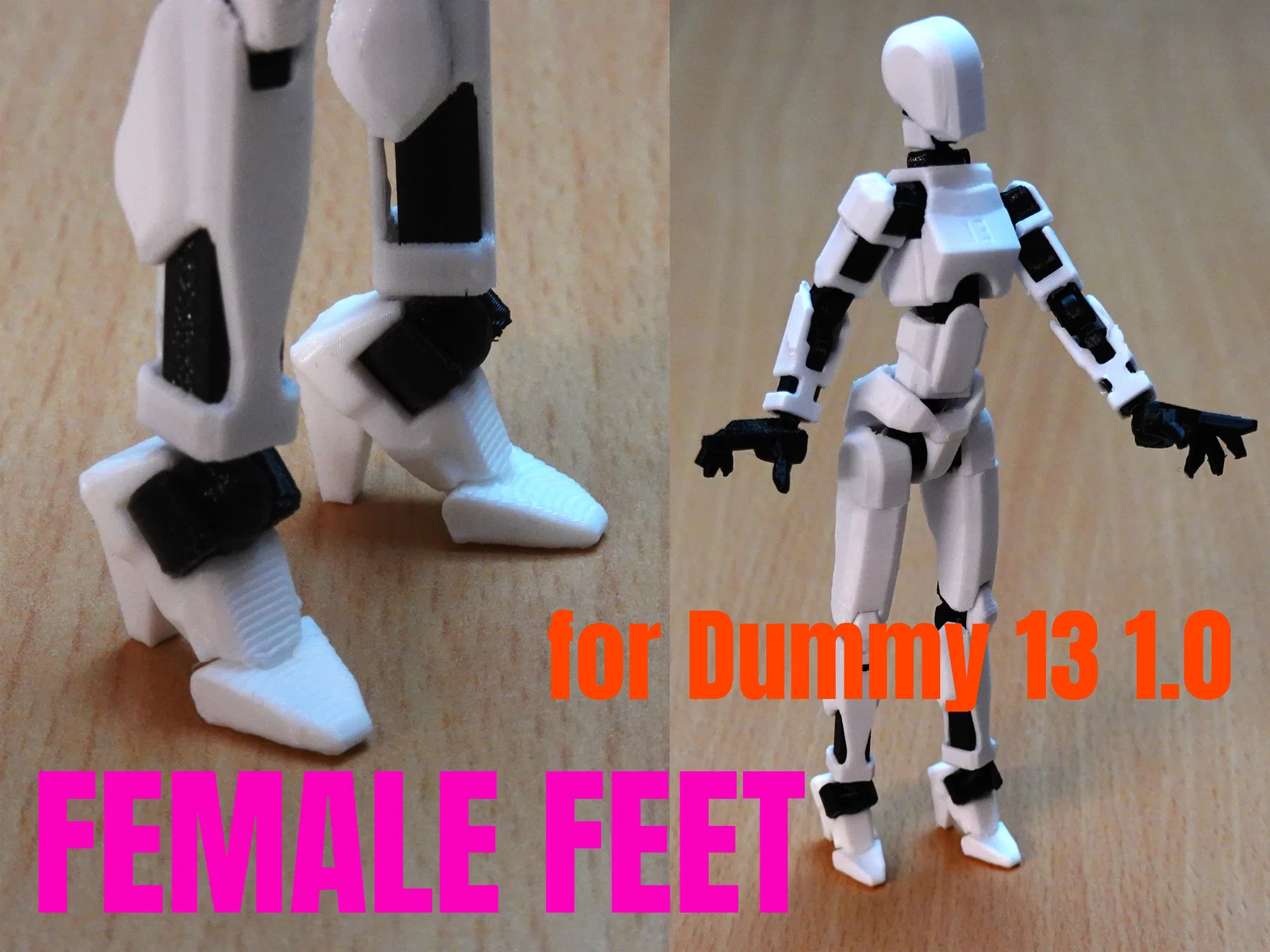 Bộ bàn chân nữ dành cho mô hình Dummy 13 V1.0. Thiết kế ưu tiên thẩm mỹ nên việc giữ mô hình đứng có thể khó hơn. File chỉ gồm phần chân, cần tải và in thêm mẫu Dummy 13 gốc để sử dụng.