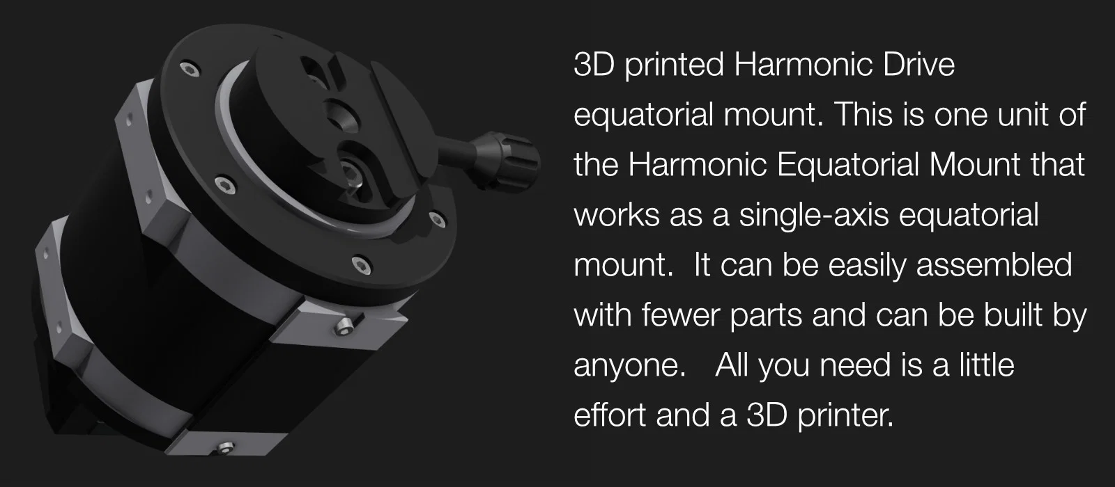 Keen-One Harmonic Drive EQ Mount (bản remix) là ngàm xích đạo Harmonic Drive in 3D, dùng PETG. Tương thích hệ OnStep, có thể dùng với Stellermate (INDI) và ASiair. Cần 2 bộ cho RA & DEC.