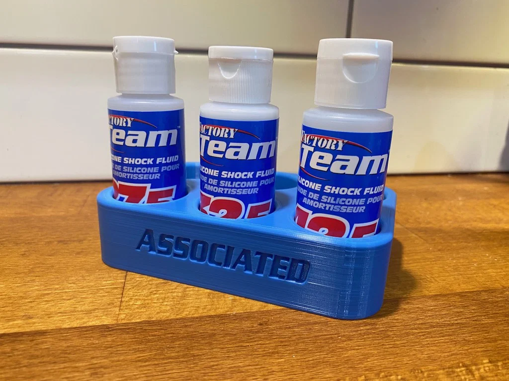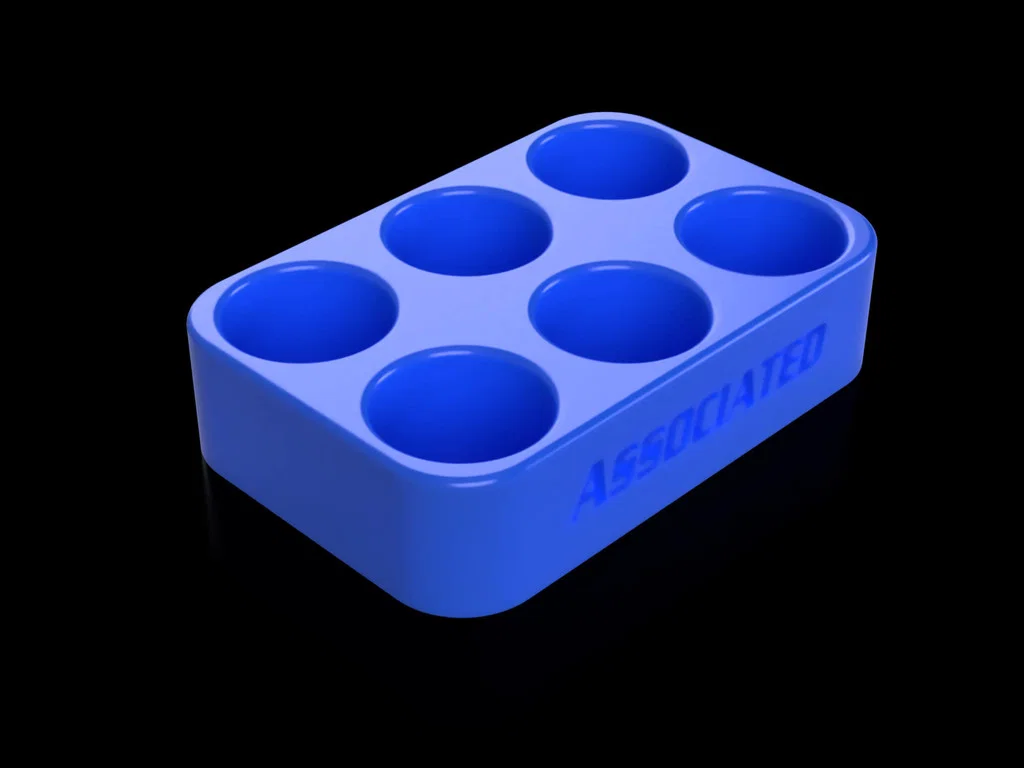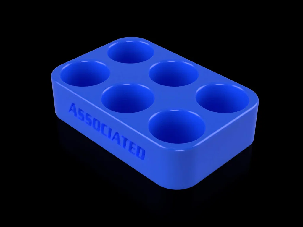 Thiết kế khay (holder) nhỏ gọn để đựng 6 chai dầu Shock và Diff của Team Associated. Có thể dập nổi (emboss) logo khác ở mặt trước theo yêu cầu, và đã có thêm phiên bản đựng 12 chai.