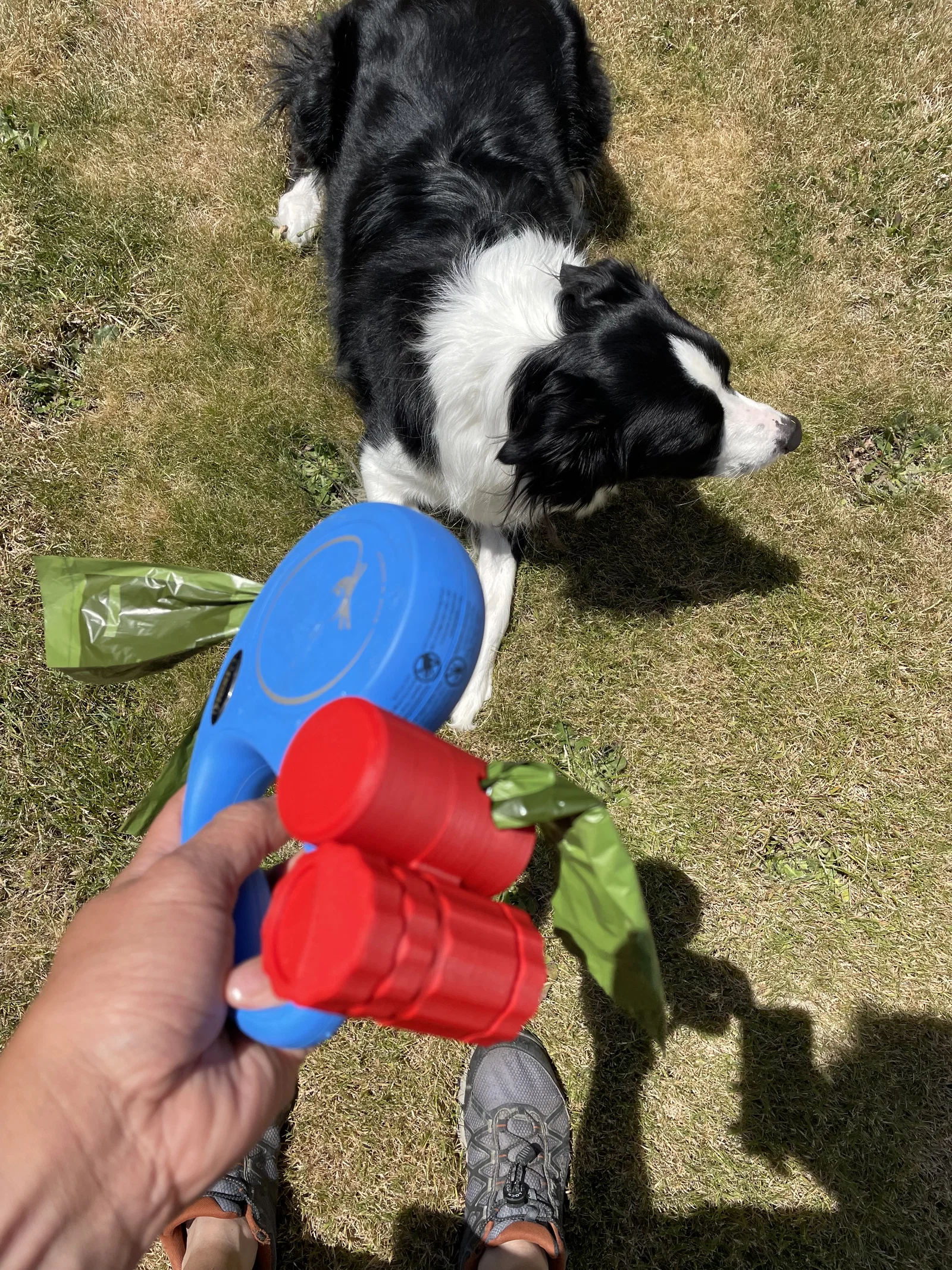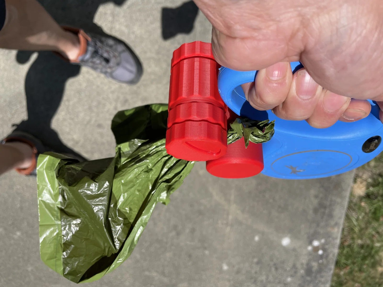 Phần “double barrel” cũng kiêm luôn chỗ kẹp túi đã đầy. Chỉ cần luồn túi vào giữa hai ống là xong, khỏi phải cầm trực tiếp trên tay.
