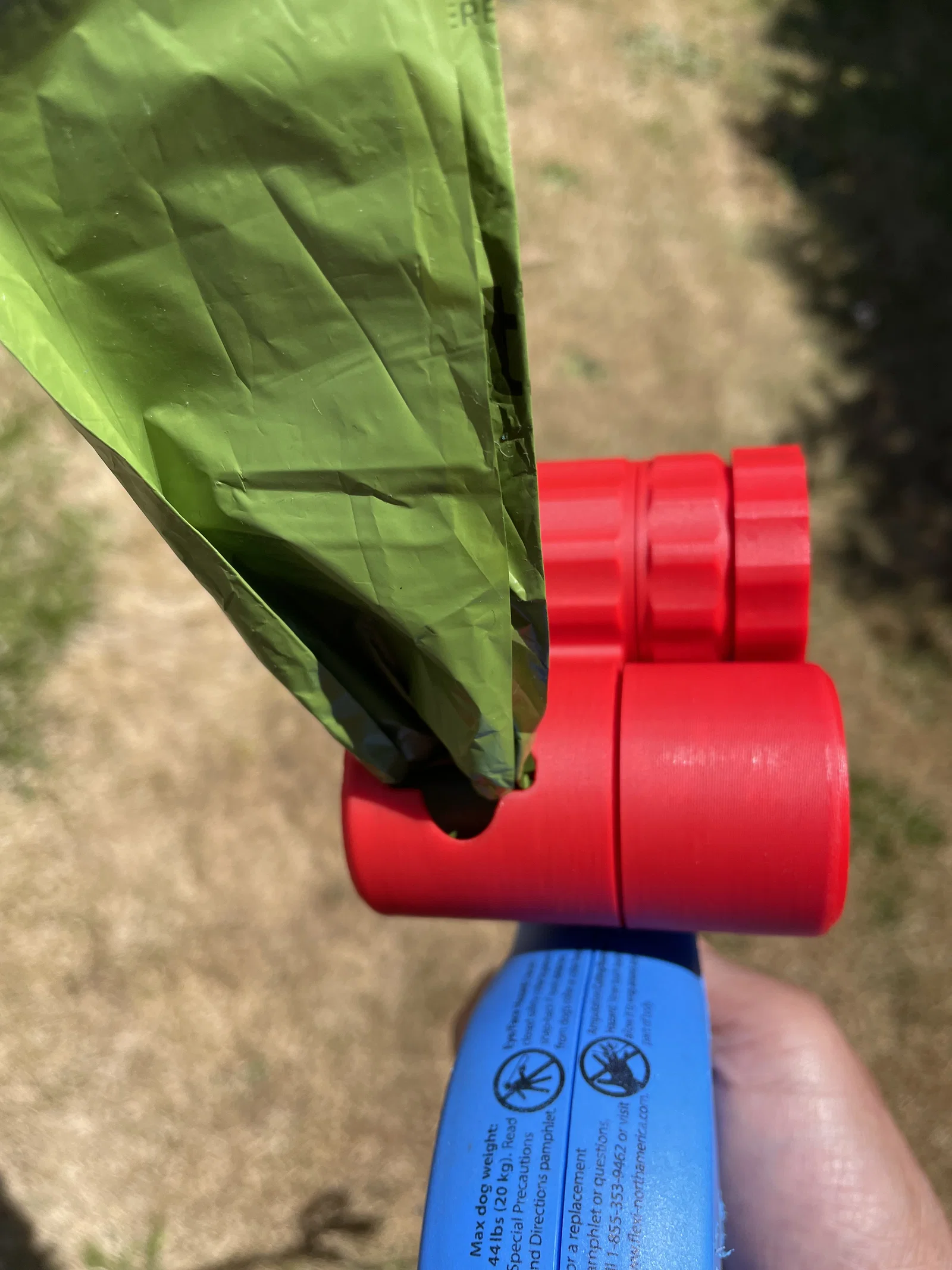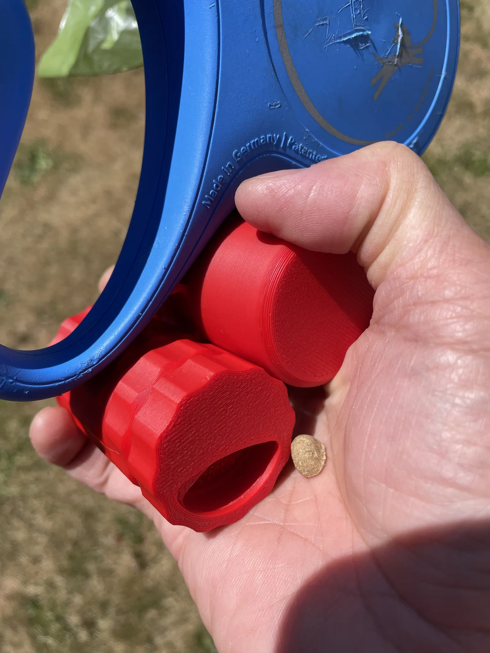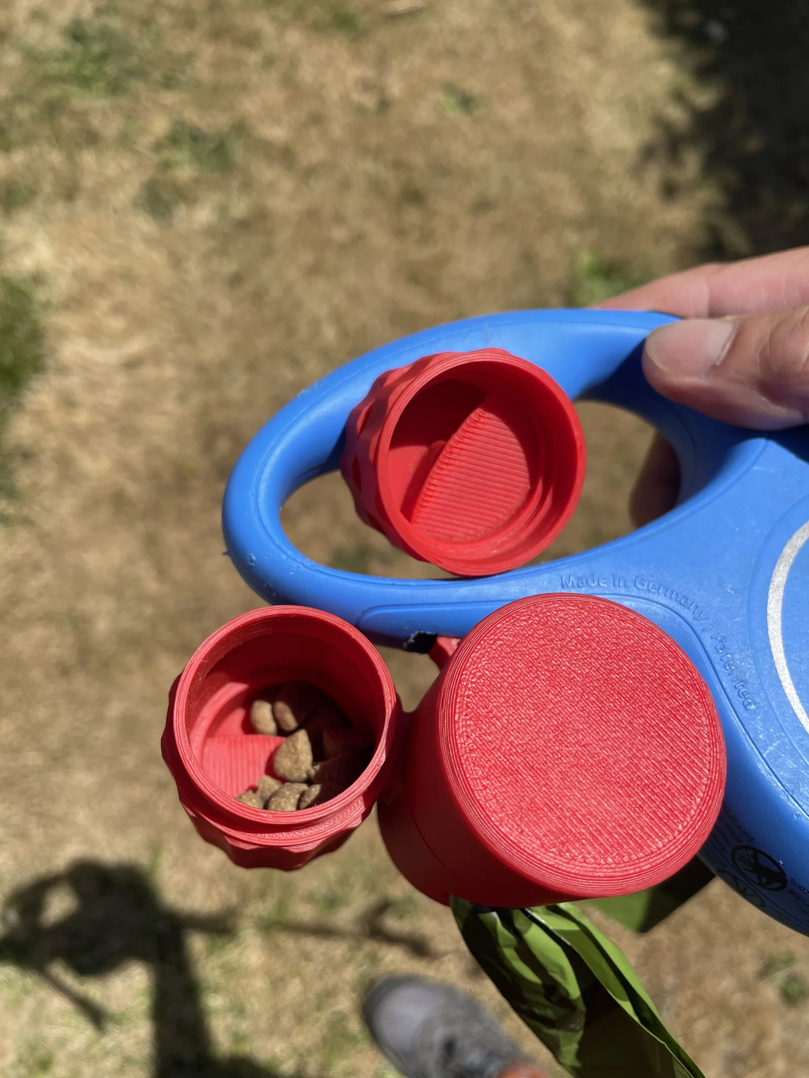 Cả hai mẫu gốc khi mình dùng riêng lẻ đều ổn, nhưng cái holder Flexi nguyên bản (mẫu mà mình remix từ đó) có vài vấn đề. Nắp hơi mỏng manh và hay bị vướng vào dây dắt. Nó có thể làm bung nắp, thế là treat bay tung toé (có lợi cho cún). Thứ hai là phần nhả túi rất khó nạp. Mình khắc phục bằng cách kết hợp hộp đựng treat rất xịn với nắp xoay vào chung thiết kế này để giải quyết chuyện đó. Mình cũng chỉnh lại hộp treat để có thêm một vách ngăn (baffle) bên trong, giúp tránh đổ ra quá nhiều treat cùng lúc. Việc này sẽ giới hạn lại ở các loại treat nhỏ kiểu Zuke hoặc dạng hạt kibble, mà mình thấy dễ dùng để train chó hơn. Thiết kế này còn là dạng hai đầu, nên cầm tay trái hay tay phải đều dùng được.