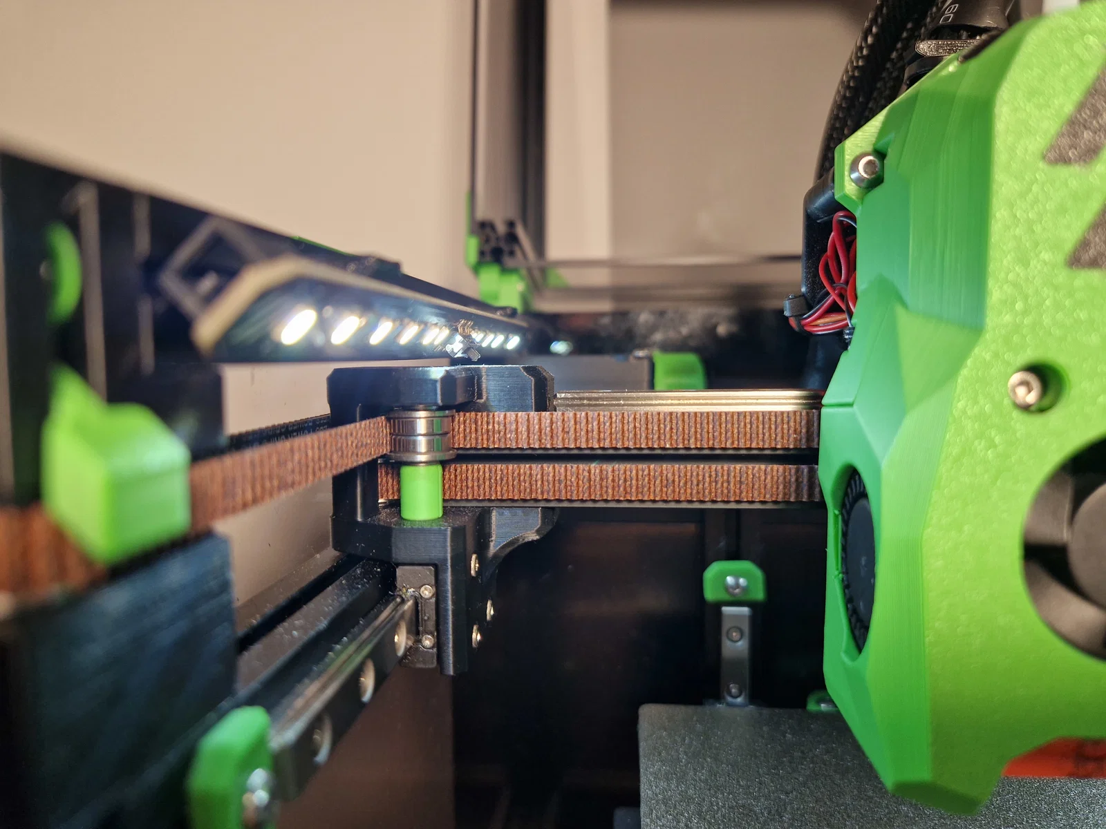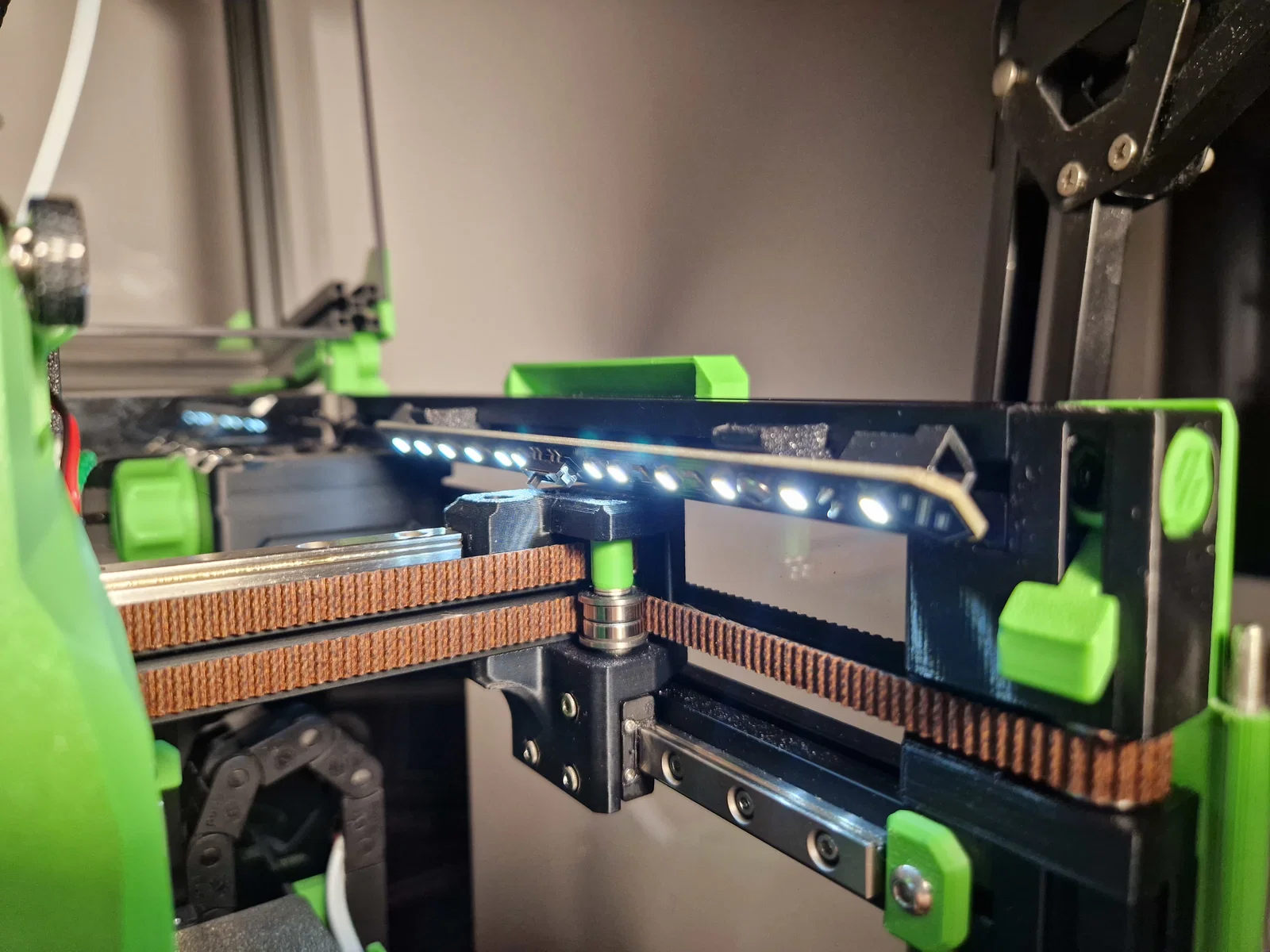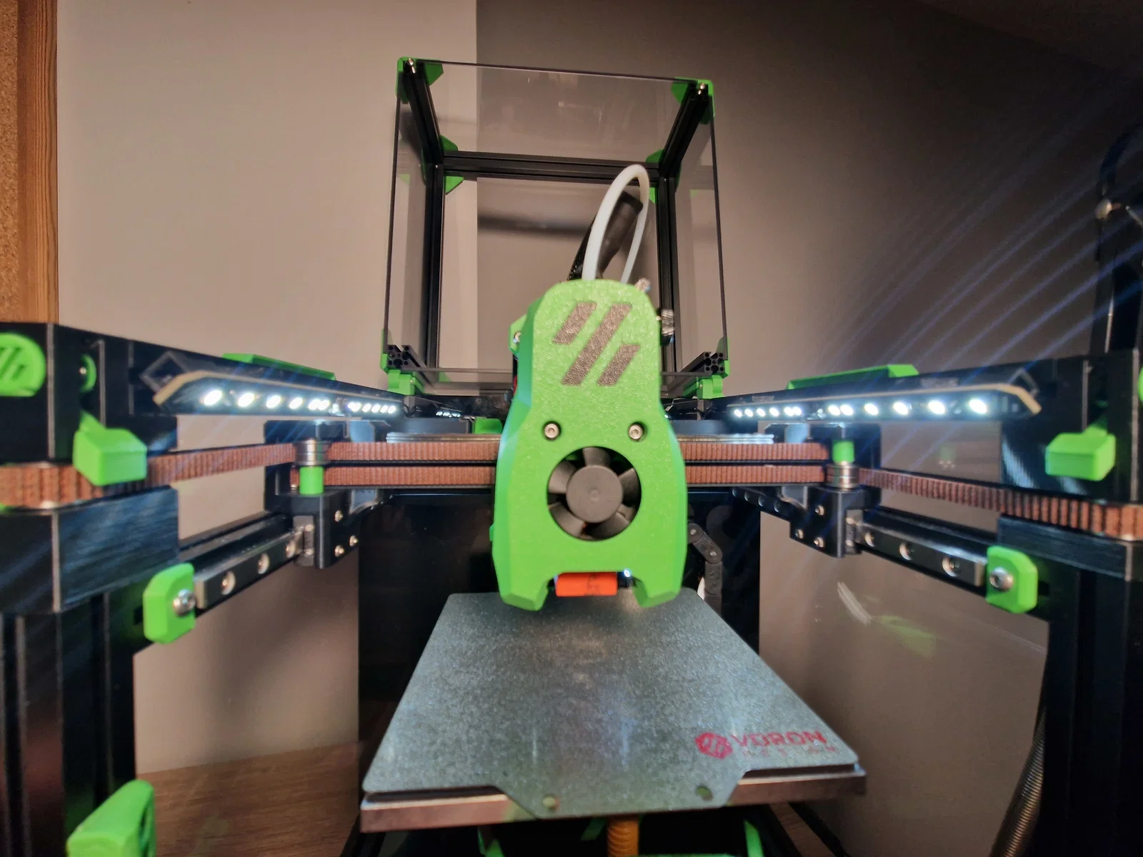 Mấy bản daylight gắn kiểu “matchstick” thường được thiết kế để bắt lên mặt trên của thanh extrusion, nhìn không được gọn gàng lắm. Mình làm một phiên bản giấu vào bên trong thân Voron, từ ngoài nhìn vô gần như không thấy. Đặt nghiêng góc 45 độ để ánh sáng rọi thẳng vào chi tiết đang in, sáng đều hơn. Đứng cách tầm nửa mét (cỡ chiều cao một con voron0 theo kiểu tính của người Mỹ) thì đèn không bị chói mắt (khác với kiểu gắn chuẩn ở extrusion phía dưới).