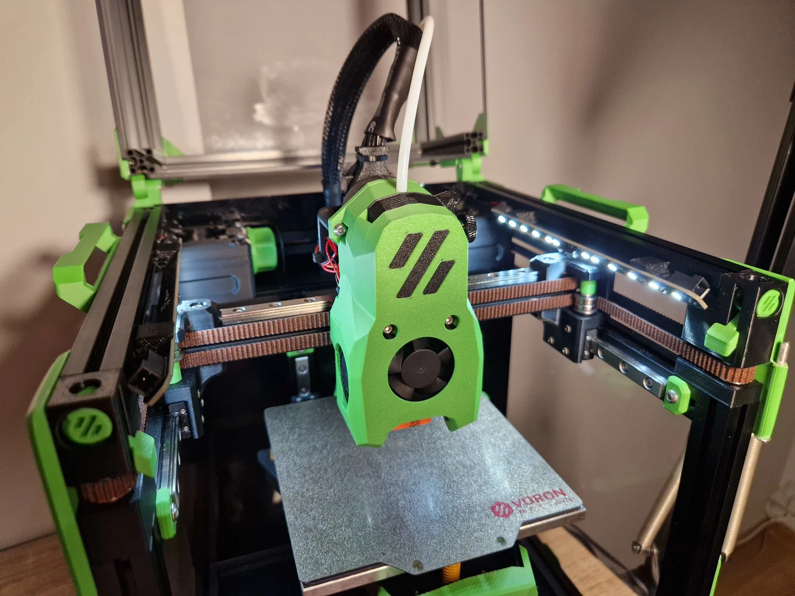 Mod daylight gắn hông cho Voron V0.2, giấu trong thân máy và nghiêng 45° để rọi sáng phần đang in tốt hơn, không chói khi đứng cách khoảng 0,5 m. Cần 4x M3 insert và 4x M3x6BHCS; dung sai rất chặt.