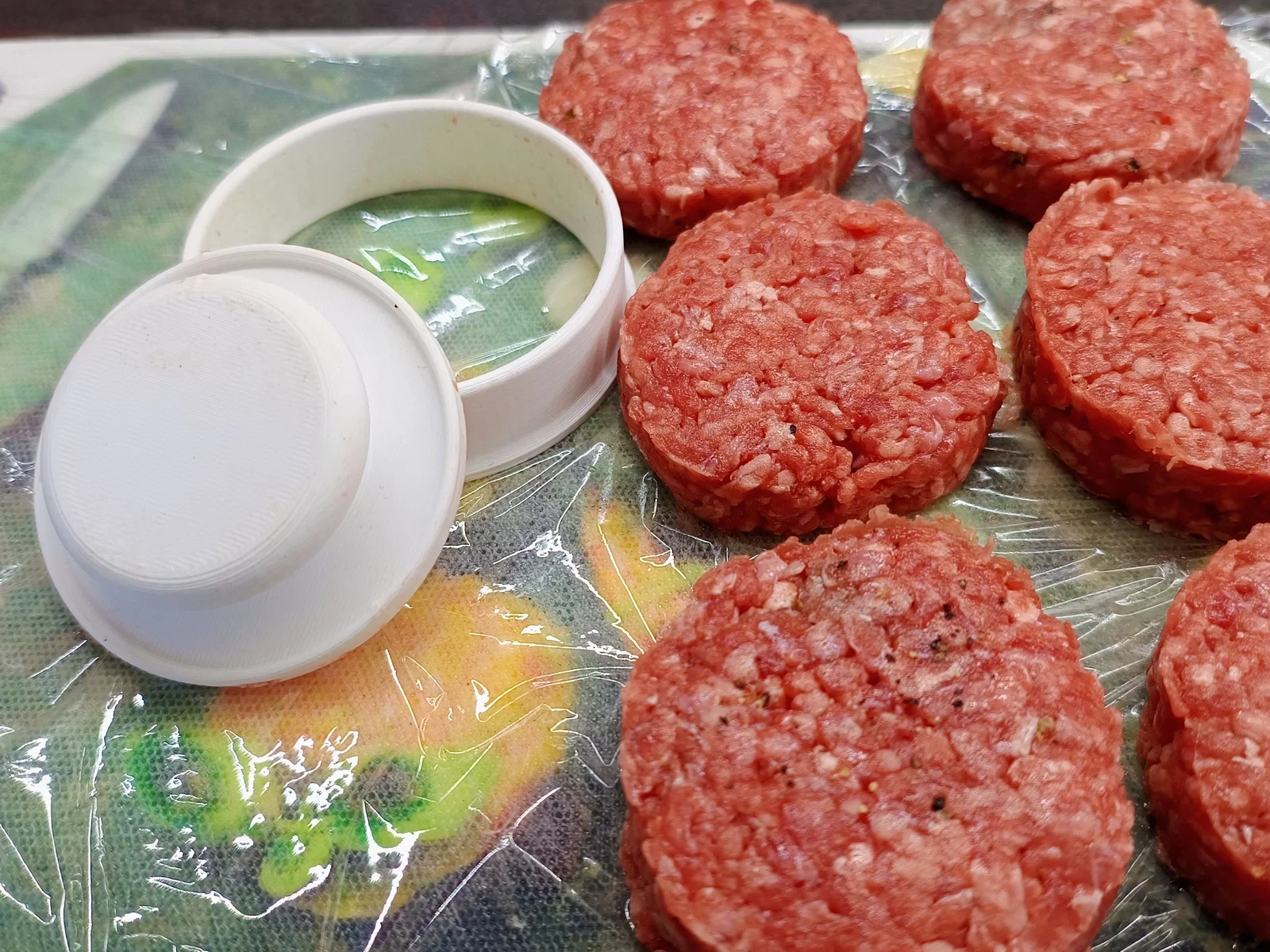 Khuôn ép tạo hình thịt xay thành hamburger với đường kính trong 70/90/110 mm và độ dày 15/20/25 mm. Khuyến nghị in PETG, làm ẩm trước khi ép và phủ sơn an toàn thực phẩm; có thể dùng màng bọc thực phẩm.