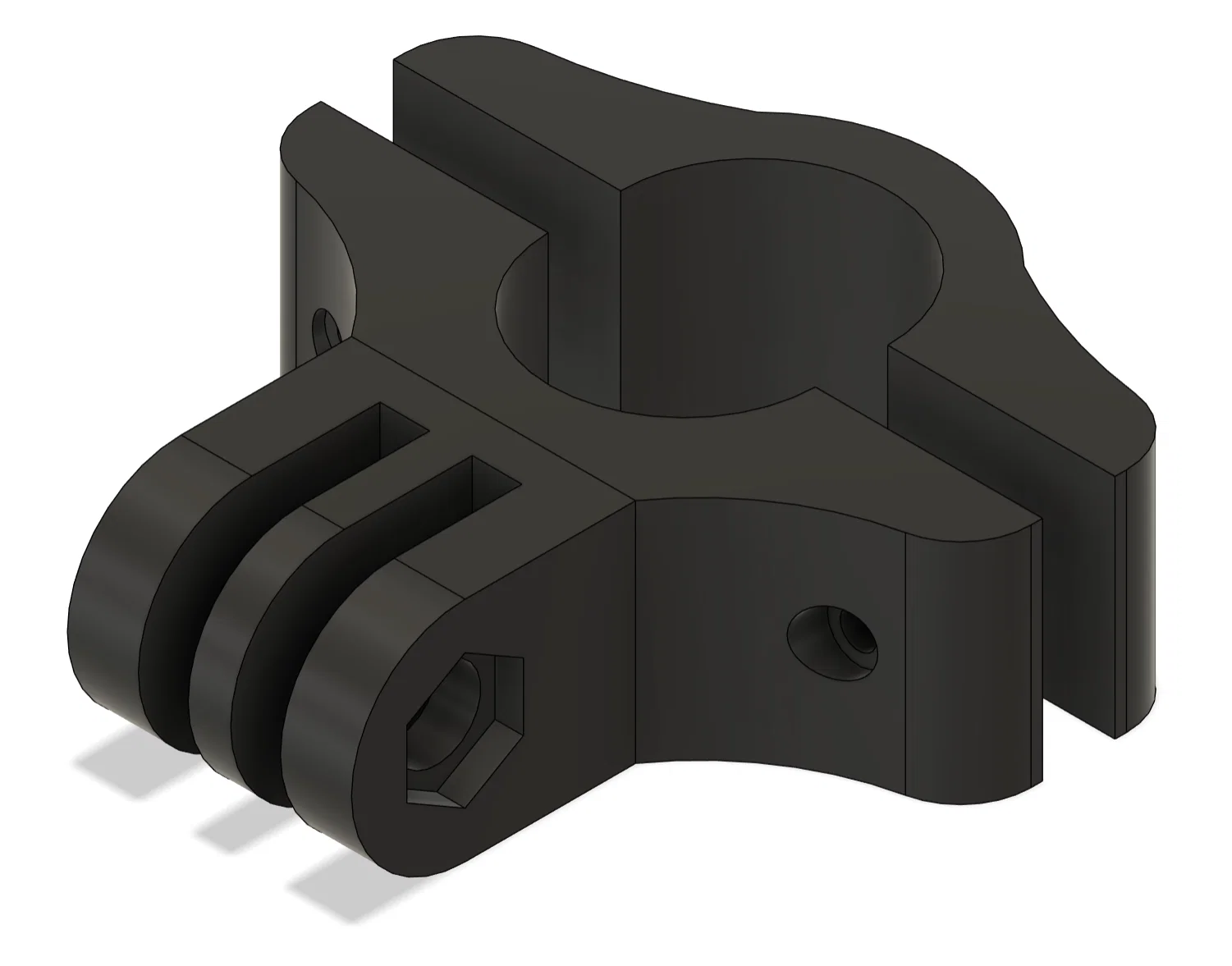 Mẫu ngàm để gắn thiết bị dùng ngàm GoPro (ví dụ: đèn xe đạp) lên một cây/cột dựng đứng. Có kèm file gốc Fusion360 để bạn chỉnh sửa khi cần đường kính cột khác.