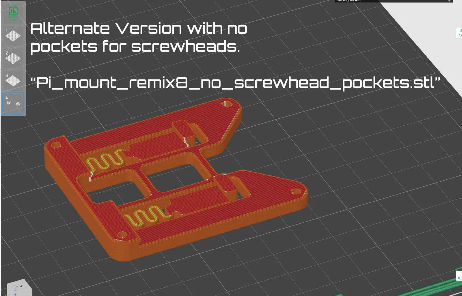 8/28/2025: Thêm một model không có các pocket cho đầu vít ở phần đế của mount. File tên “Pi_mount_remix_no_screwhead_pockets.stl.”