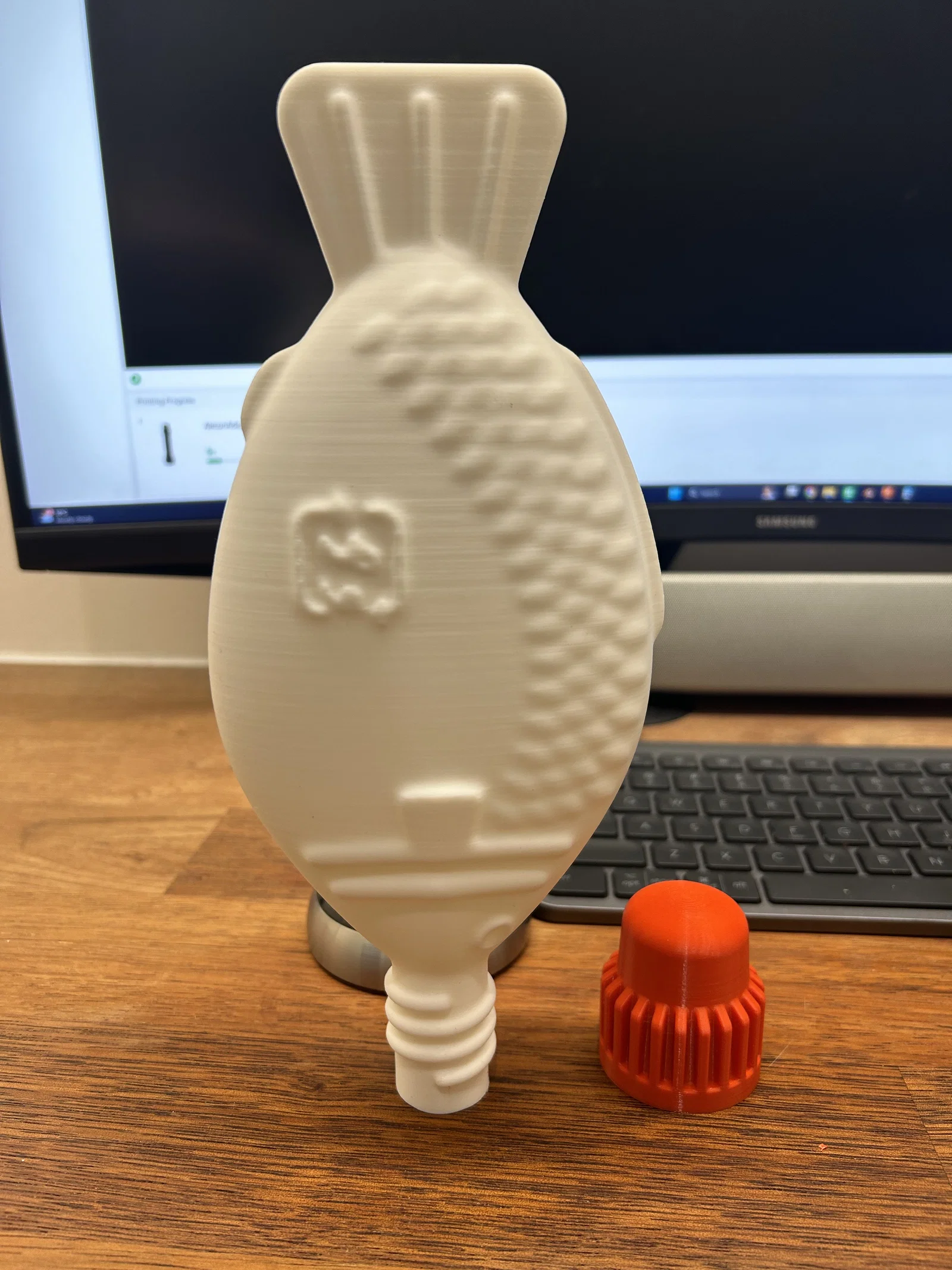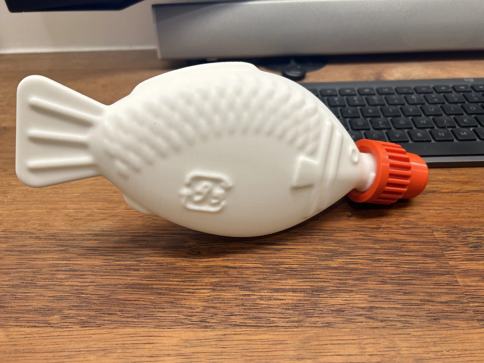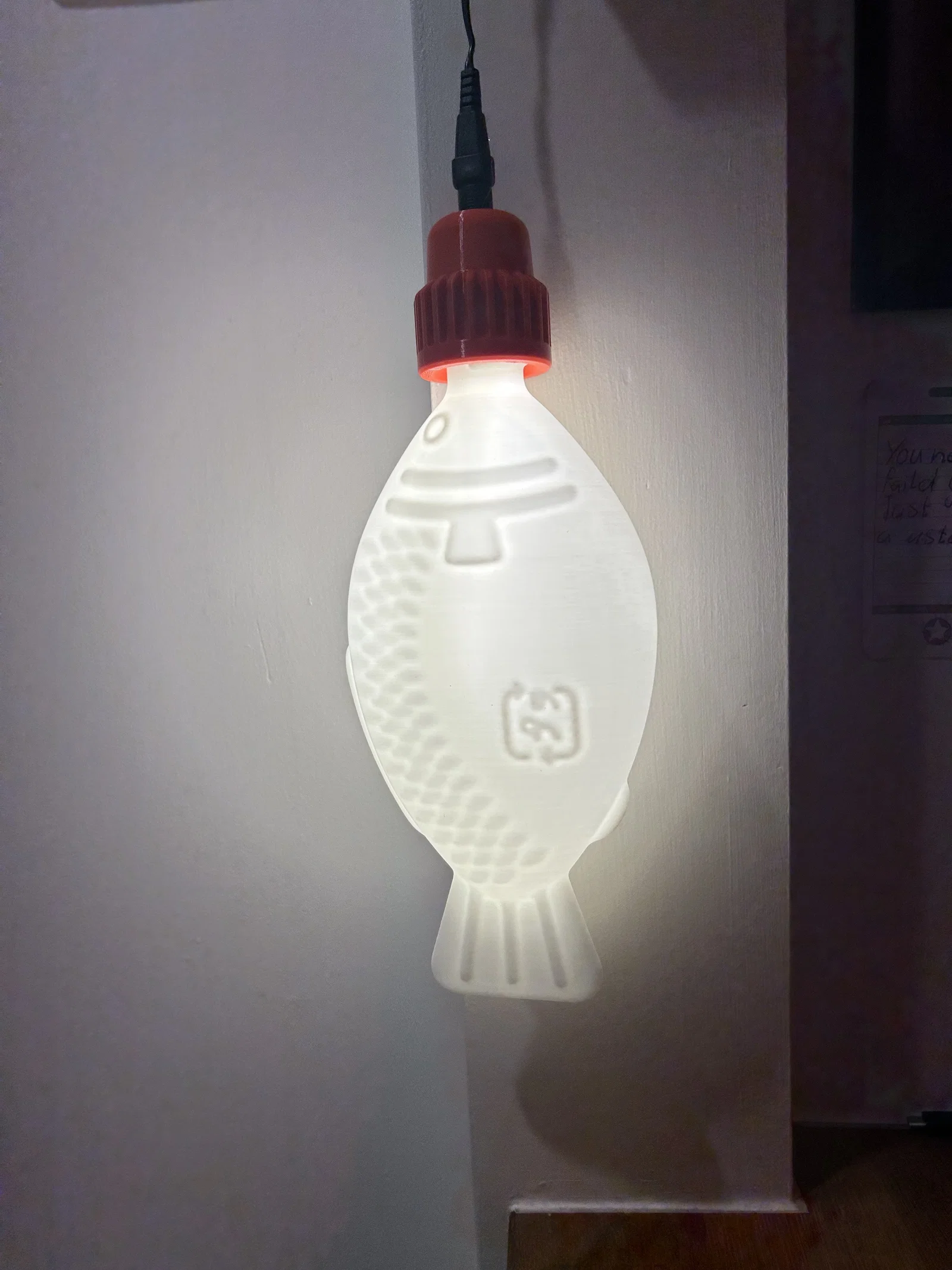 Mẫu chai nước tương sushi hình cá được phóng to, có thể lắp LED để làm đèn. Thiết kế in dựng đứng trên mũi, không cần supports, đã scale cho Bambu X1C; thành dày khoảng 2mm, kèm 2 mẫu nắp.