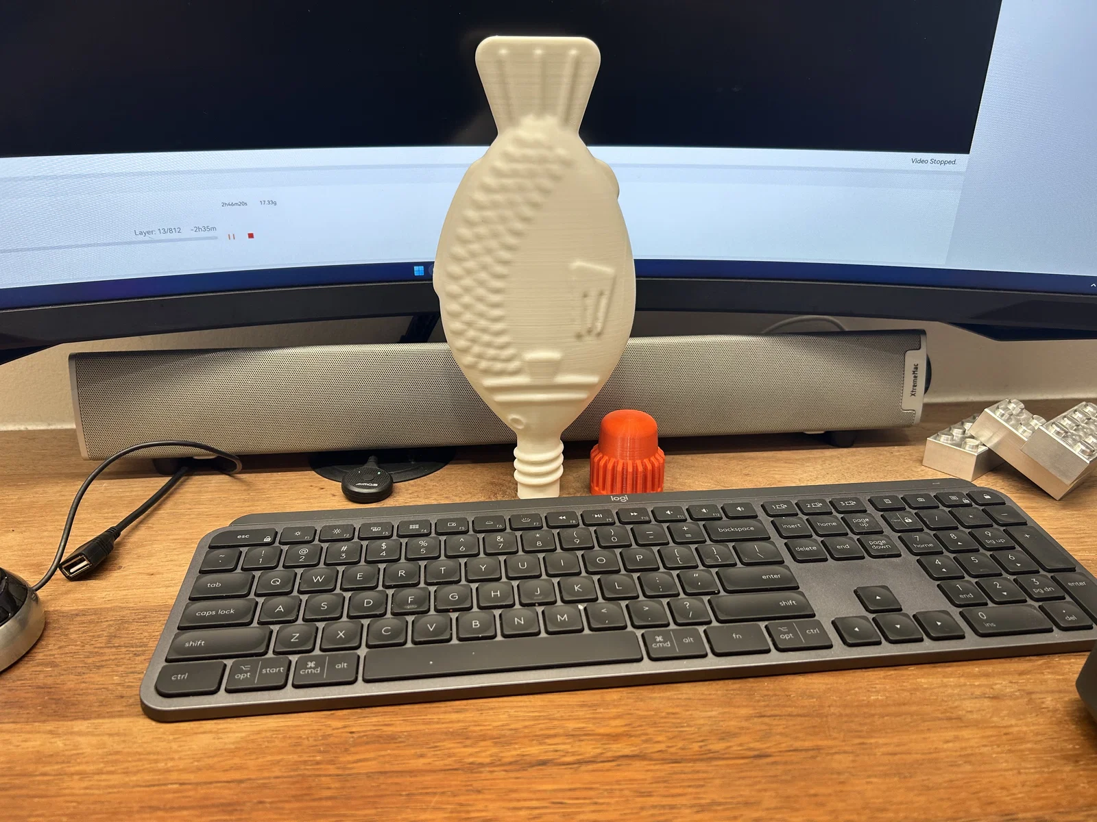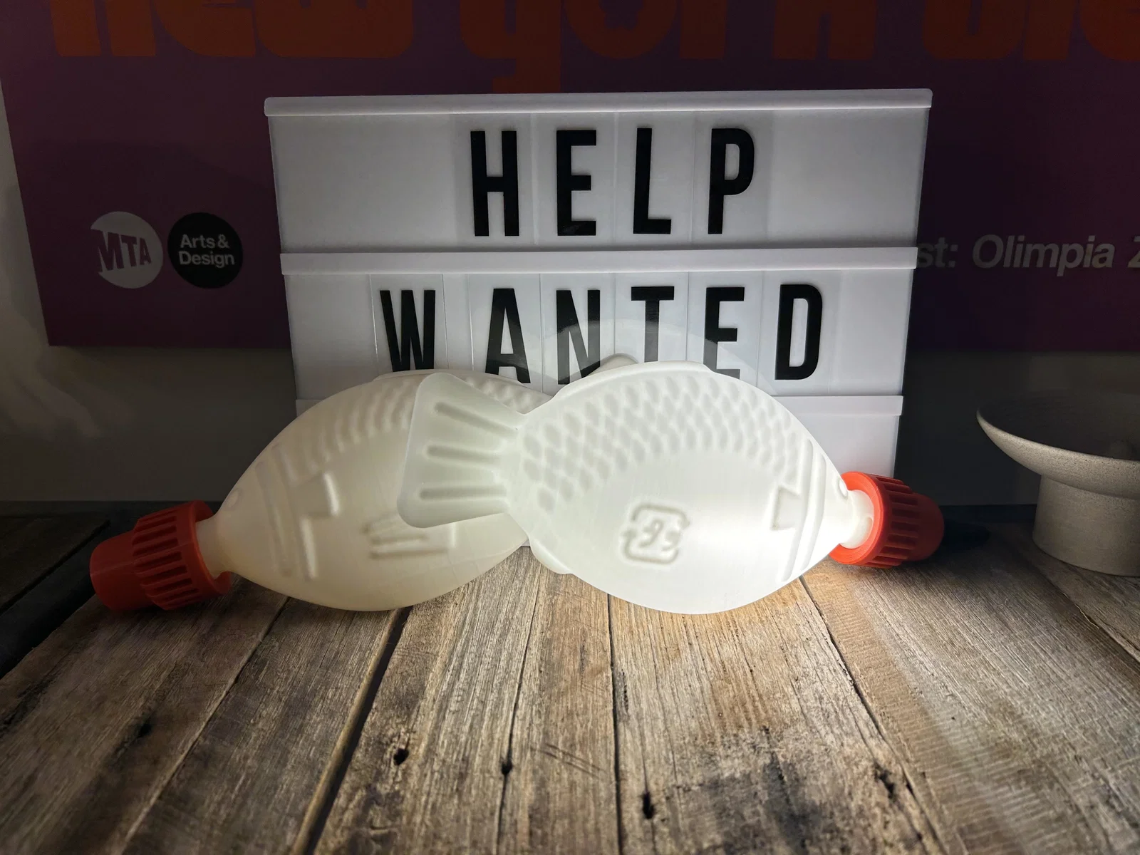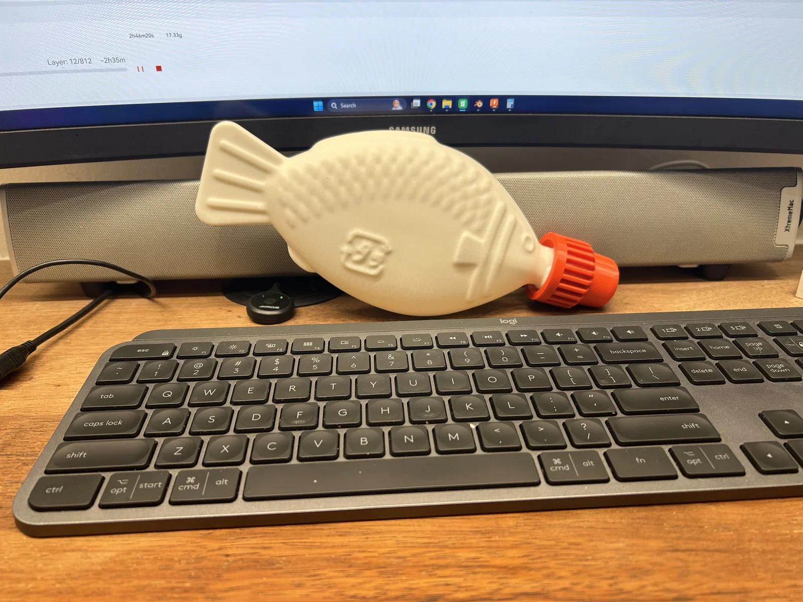 Mẫu chai nước tương sushi hình cá được phóng to, có thể lắp LED để làm đèn. Thiết kế in dựng đứng trên mũi, không cần supports, đã scale cho Bambu X1C; thành dày khoảng 2mm, kèm 2 mẫu nắp.