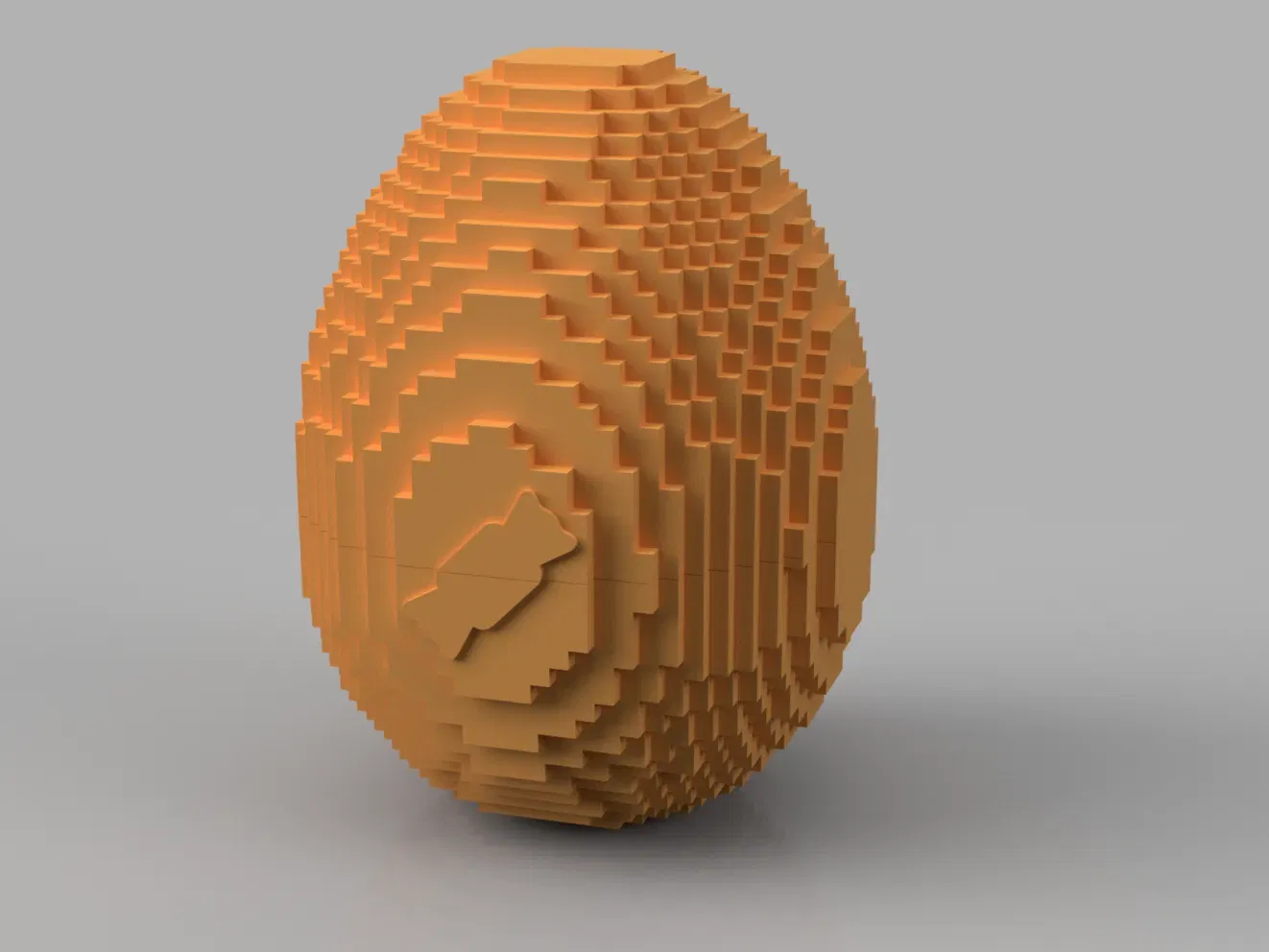 Tôi đã chọn làm một quả trứng pixel hóa vì tôi chưa thấy cái nào trước đây, và các yếu tố thiết kế pixel hóa, cùng với khoảng trống giữa hai nửa thu hút sự chú ý khỏi phần vít ẩn ở dưới cùng cho phép quả trứng mở ra. Để tăng thêm sự bực bội, tôi khuyên nên định hướng các họa tiết kẹo ở hai bên đối diện của quả trứng, để ngụ ý rằng câu đố nên được giải quyết thông qua việc xoay các nửa quả trứng theo cách nào đó… (điều này không đúng).