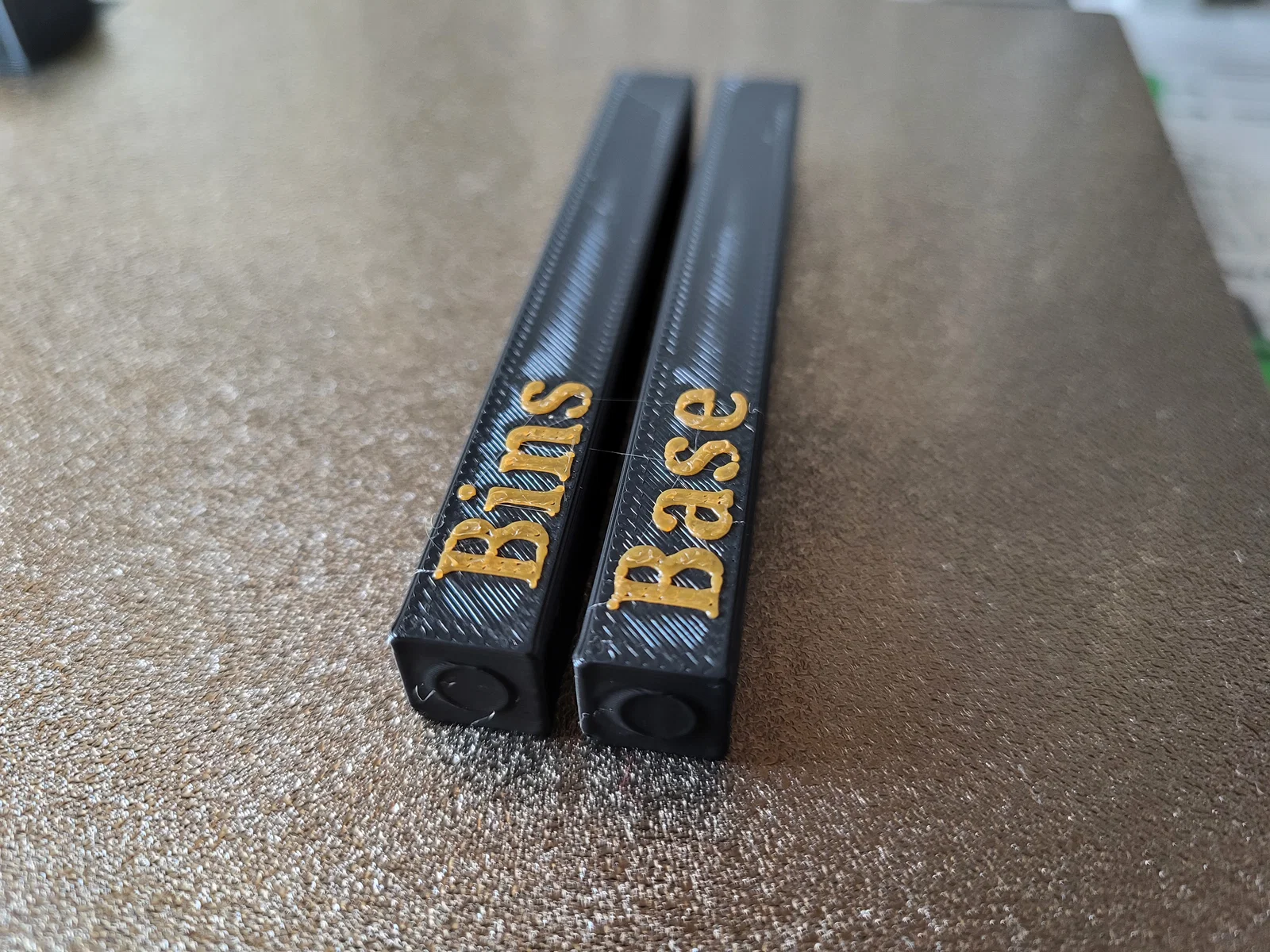 Mình dập nổi chữ Bins và Base lên trên để biết cần dùng cái nào cho đúng ;) Phần đầu để nhét nam châm vào không phẳng hoàn toàn: có một vòng tròn nhô lên khoảng 0.2mm để giúp đưa nam châm vào lỗ của base/bins dễ hơn.