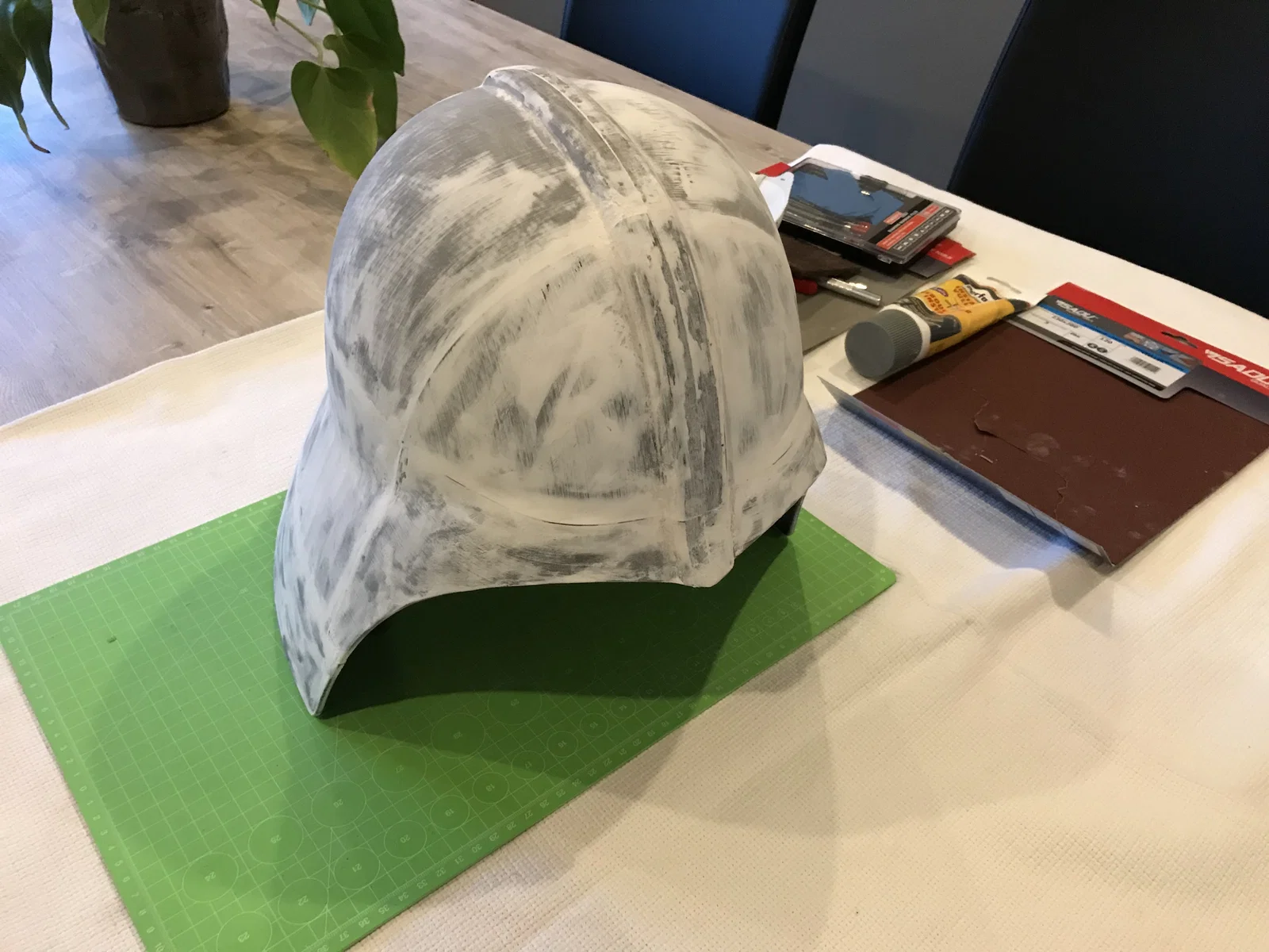 Phần helmet và mask chỉ khớp với nhau nếu mask được nâng lên khỏi mặt phẳng. Để giải quyết, mình “thiết kế” một cái stand. Bạn có thể tìm stand ở đây: