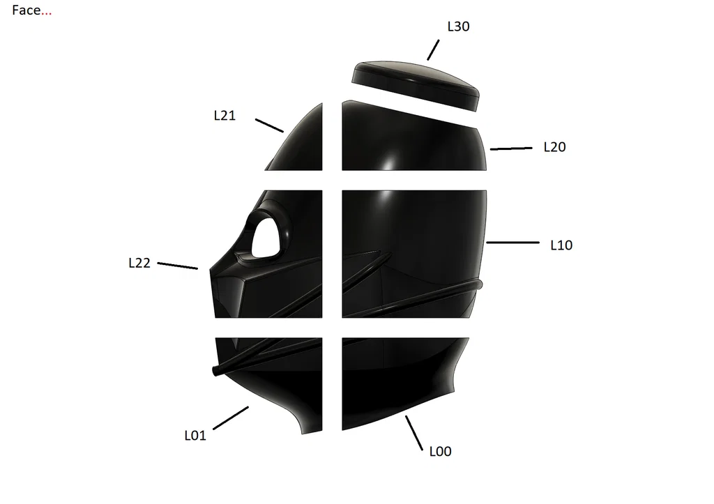 Nếu bạn muốn có tuỳ chọn đeo được cái mask, nhớ giữ các phần phía sau (FaceR00, FaceR10, FaceL00, FaceL10) tách riêng khỏi phần còn lại. Dùng các lỗ canh để đảm bảo mọi thứ khớp với nhau, nhưng đừng dán 4 phần đó vào các phần khác (chỉ dán chúng với nhau thôi). Mình dùng keo nến dán velcro lên phía trên, và gắn nam châm hai bên để búng/khớp mask lại với nhau.