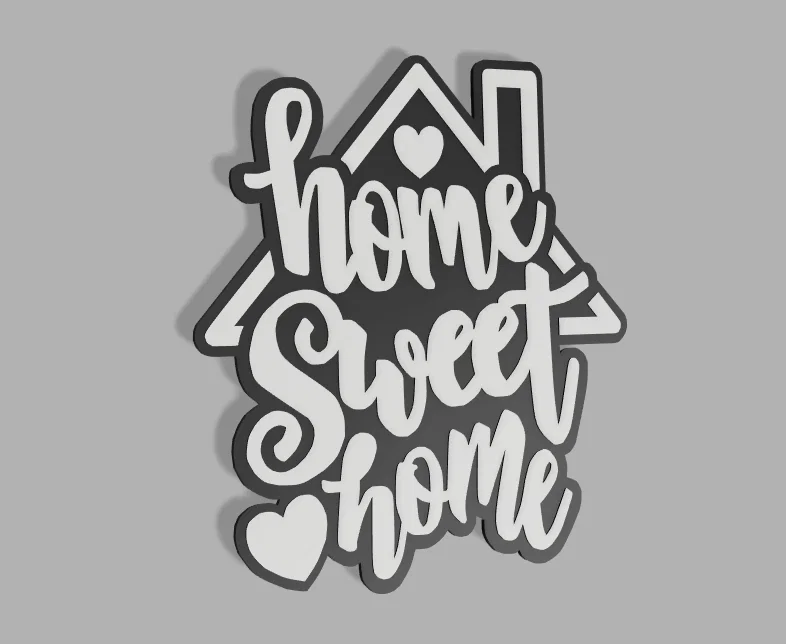 Mẫu trang trí chữ “Home sweet home” dạng wall art. Gợi ý đổi màu khi in: 0.0–2.0mm dùng PLA đen, 2.2–2.6mm dùng PLA trắng để chữ nổi bật, nhìn sạch và đẹp khi treo tường.