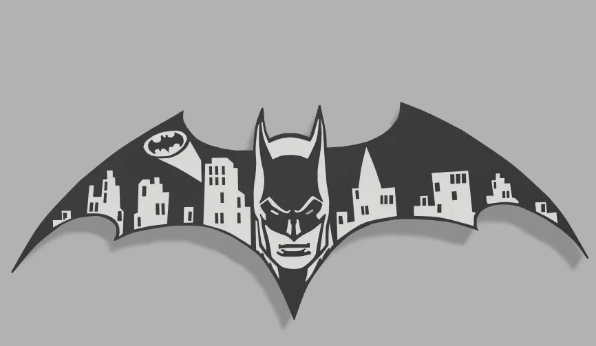 Mẫu wallart 2D chủ đề Batman (Gotham) để in treo tường. Gợi ý thiết lập màu theo layer height: 0.0–2.0mm dùng PLA đen, 2.2–2.4mm dùng PLA trắng để ra đúng mảng màu.