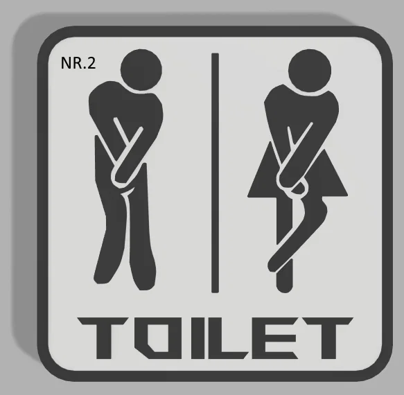Mẫu bảng hiệu nhà vệ sinh vui nhộn “Toiletsign (urge to pee)”. Hướng dẫn in 2 màu theo layer height: trắng từ 0–2.0 và đen từ 2.2–3.0. Có tùy chọn giấy phép thương mại qua Patreon.