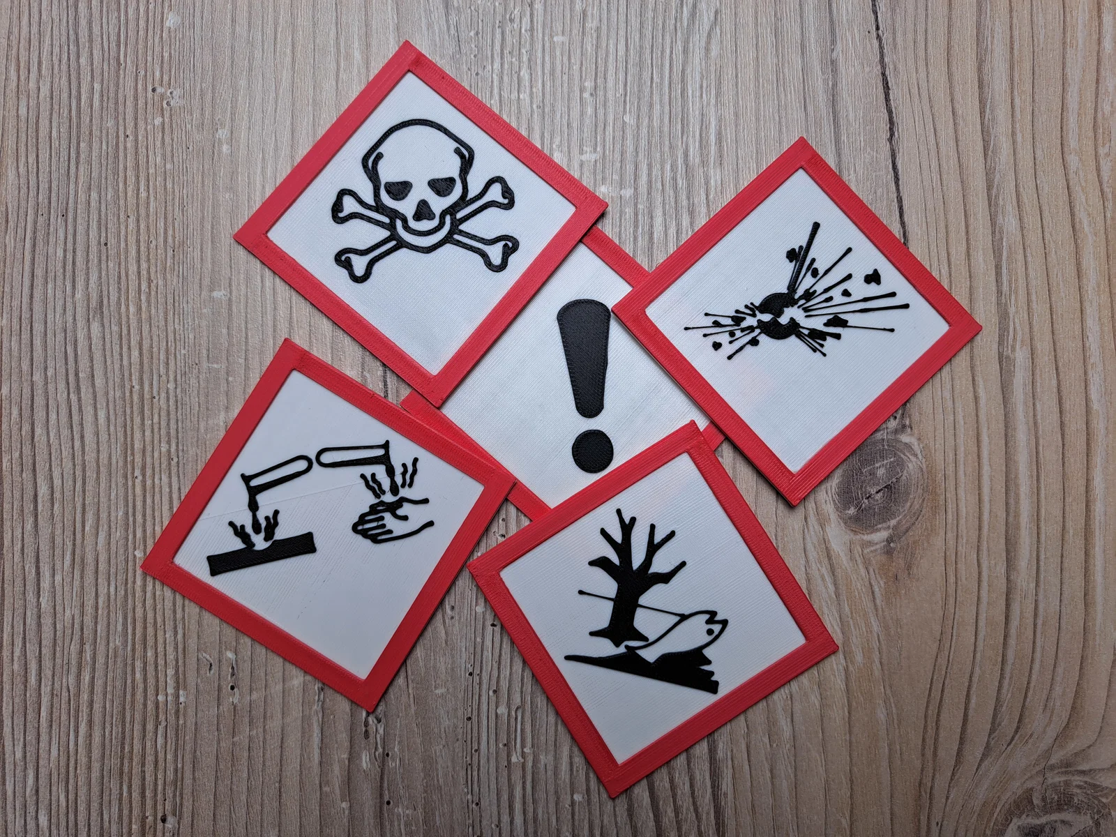 Bộ sưu tập các pictogram nguy hại GHS cho hóa chất gồm nhóm nguy hại Vật lý, Sức khỏe và Môi trường (GHS01–GHS09). Mỗi pictogram nằm trên 1 printing plate trong Bambu Studio, đã tô màu sẵn và cần AMS.