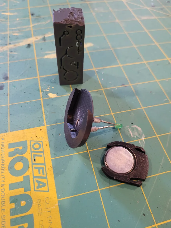 Mình khoét rỗng mẫu của họ (có kèm supports) để có thể chứa LED và điện trở, rồi ghép với đế 40mm do mình làm riêng, có khoang để pin.