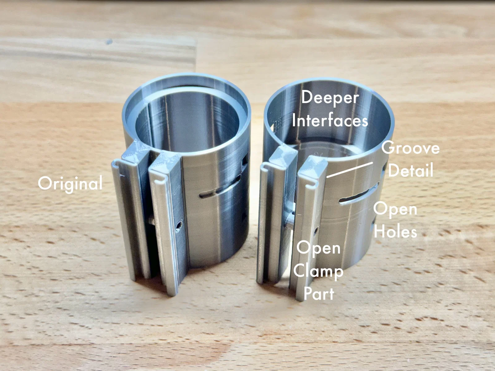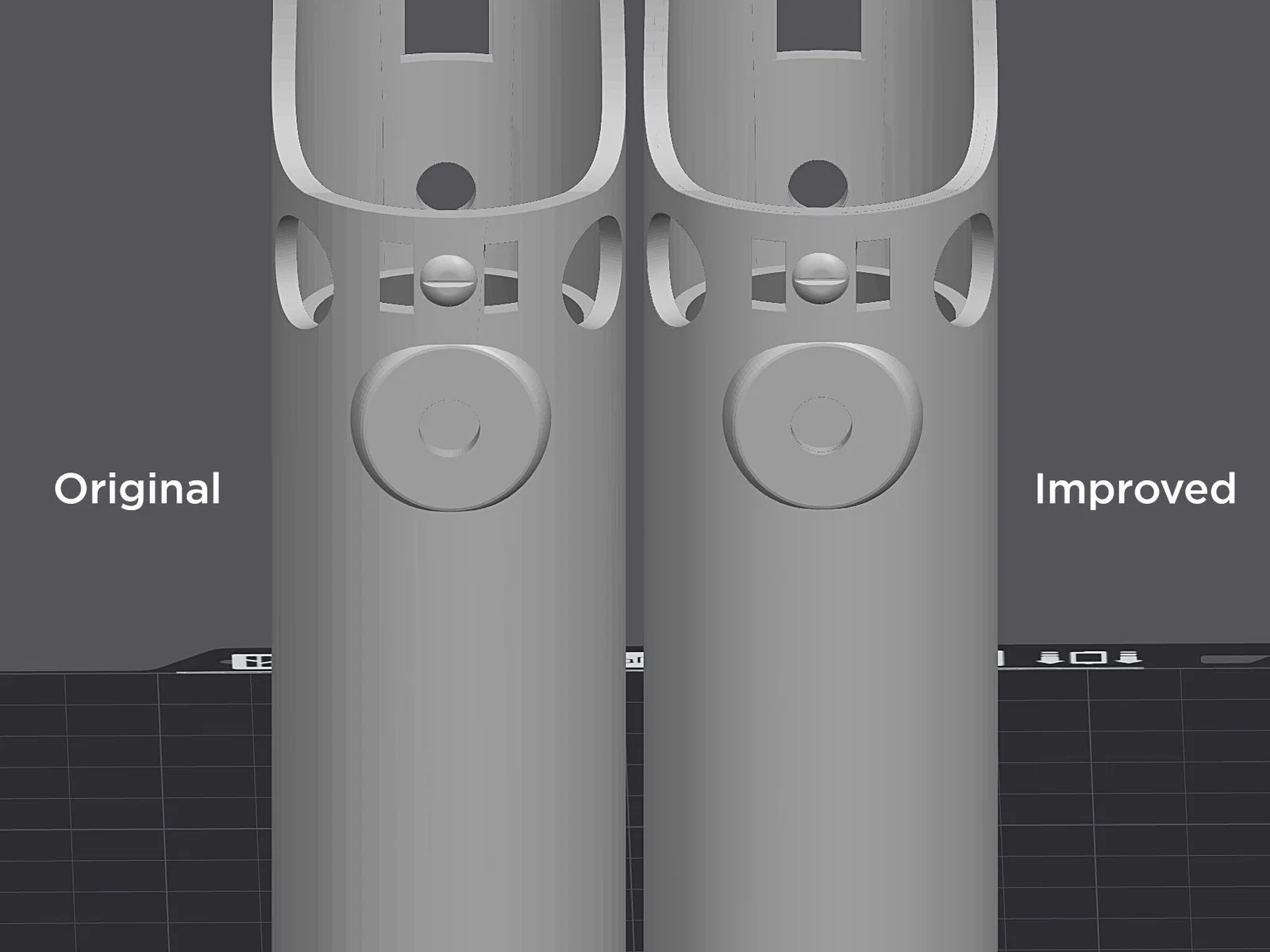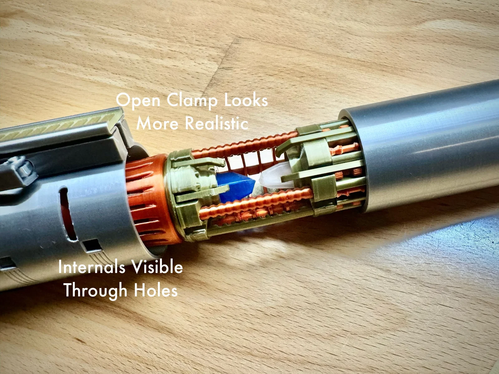 Mình đã thiết kế lại phần clamp và chỉnh lại chiều dài phần trên/dưới để đúng hơn với cách một ống flash Graflex “authentic” tháo lắp. Giờ khi mở saber để lộ crystal chamber, phần trên sẽ không bị quá ngắn và các chi tiết lỗ trên clamp cũng không còn bị “đóng” lại. Những part này cũng có bề mặt ngoài mịn hơn (cải tiến từ bản remix khác của mình).