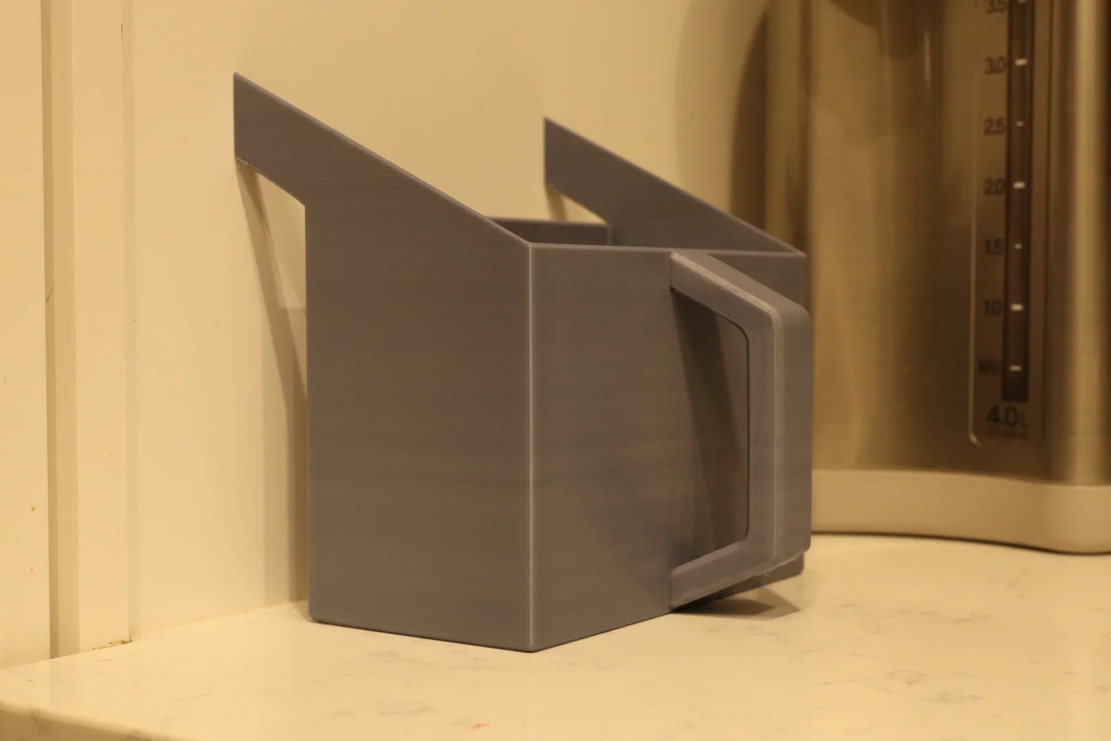 Sản phẩm này được thiết kế với phần tay cầm chắc chắn giúp bạn dễ dàng cầm nắm và di chuyển quanh bếp. Điểm đặc biệt nhất là phần vây kẹp (clip-on fins) cho phép khay cố định ổn định ngay tại mép bàn hoặc đặt đứng vững chãi trên bề mặt phẳng. Khi in 3D, bạn hoàn toàn không cần phải dùng đến vật liệu hỗ trợ (support), giúp bề mặt in hoàn thiện đẹp mắt và tiết kiệm nguyên liệu in ấn, đảm bảo mang lại cho bạn một phụ kiện nhà bếp vừa hữu ích vừa thẩm mỹ.