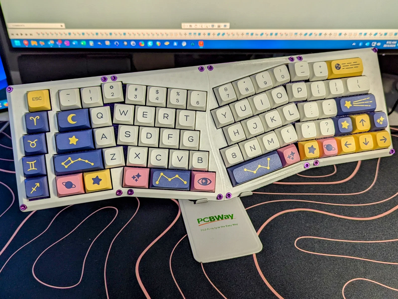 Đây là phiên bản bàn phím cơ kiểu Alice của mình. Mục tiêu chính là thêm cụm phím mũi tên và tận dụng hết phần không gian trống có thể. Thân bàn phím được thiết kế đối xứng. Bàn phím này được thiết kế theo cùng phương pháp như một số dự án khác của mình: mình bắt đầu với layout trong Keyboard Layout Editor, copy dữ liệu qua một plate generator rồi import kích thước plate vào Fusion360 dưới dạng file DXF. Bàn phím này không phải là bản tái tạo y chang bất kỳ layout Alice cụ thể nào. Tất cả các phần đều có thể in trên máy in 3D nhỏ và không cần supports.