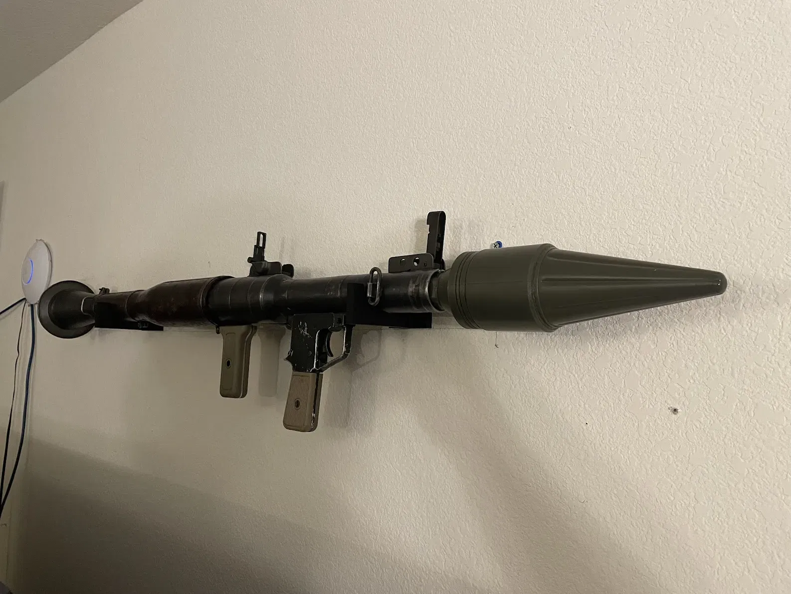 Giá treo tường đơn giản cho RPG-7. Sử dụng hai giá đỡ để giữ phần ống phía sau (bằng gỗ) và phần ống phía trước ngay sau phần tay cầm/cò.