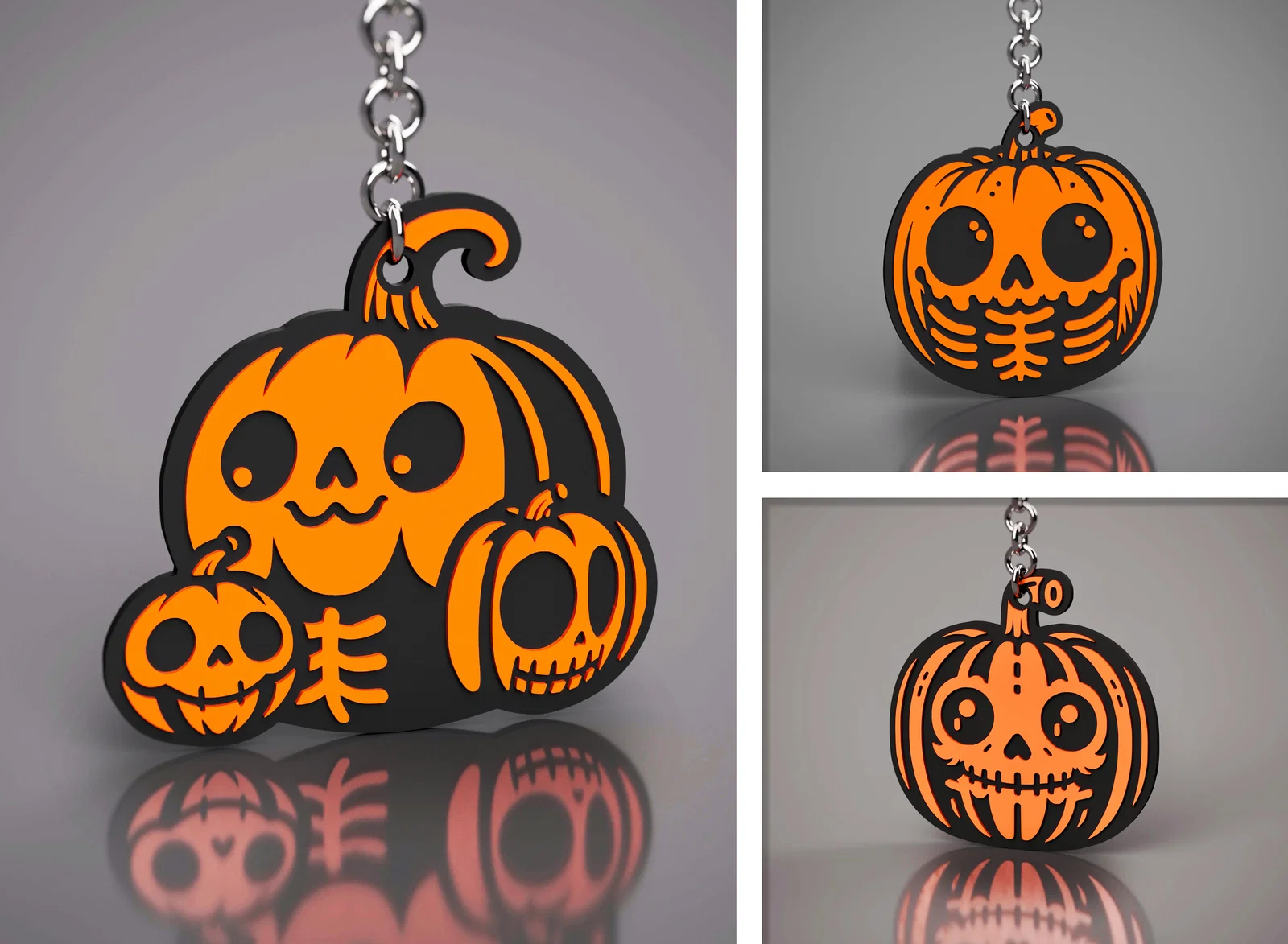 Bộ 3 thiết kế bí ngô làm móc khóa Halloween Skeleton Edition. Hướng dẫn in đổi màu bằng cách pause ở layer 11: in màu đen trước rồi đổi sang trắng. Khuyến nghị chạy chậm, infill 100%, ưu tiên PETG để hạn chế biến dạng do nhiệt.