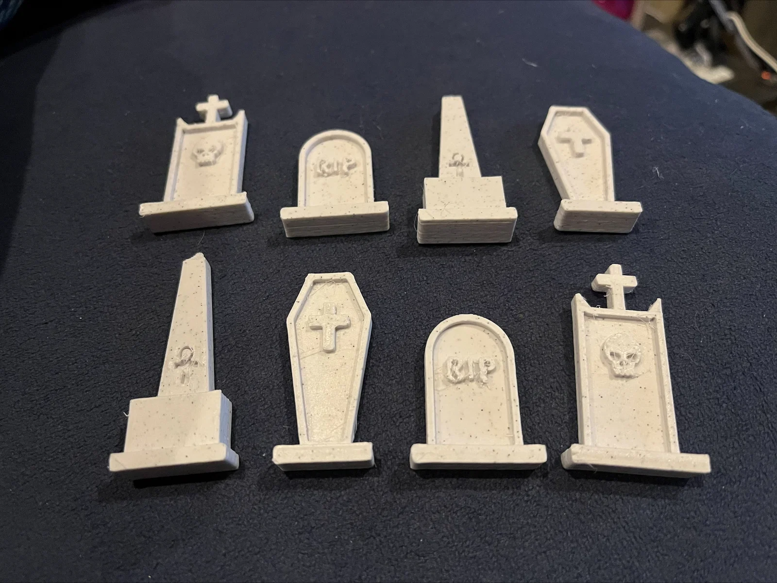 Chỉ là vài mẫu bia mộ làm nhanh mà mình dựng cho một dự án diorama mini. Kích thước các mẫu nằm trong khoảng 43 đến 71mm, nhưng chắc không có vấn đề gì lớn khi scale lên, hoặc thậm chí scale xuống (nhưng chỉ giảm chút thôi kẻo mất chi tiết). Mấy mẫu này được thiết kế theo kiểu 2.5D, nên có thể không phù hợp nếu nhu cầu của bạn thiên về 3D hơn. Mình in chúng nằm ngửa trên “lưng”, rồi dùng ironing trên bề mặt nên mặt in ra khá mịn và phẳng. Dự định là sẽ làm thêm hiệu ứng weathering, nhưng trong bài này mình để nguyên tình trạng vừa in xong (as-printed).