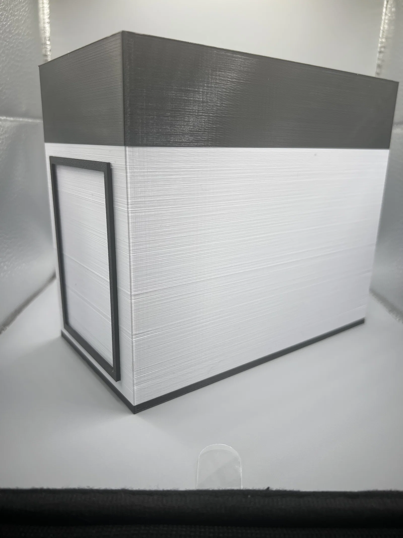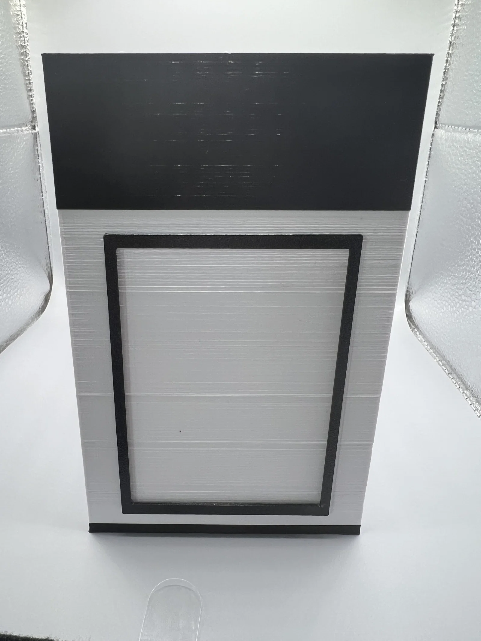 Mặt trước của hộp có một khung thẻ (kích thước tiêu chuẩn) có thể gắn thêm (dán keo) để bạn luồn một lá TCG card vào, giúp phân biệt loại thẻ đang được cất bên trong.