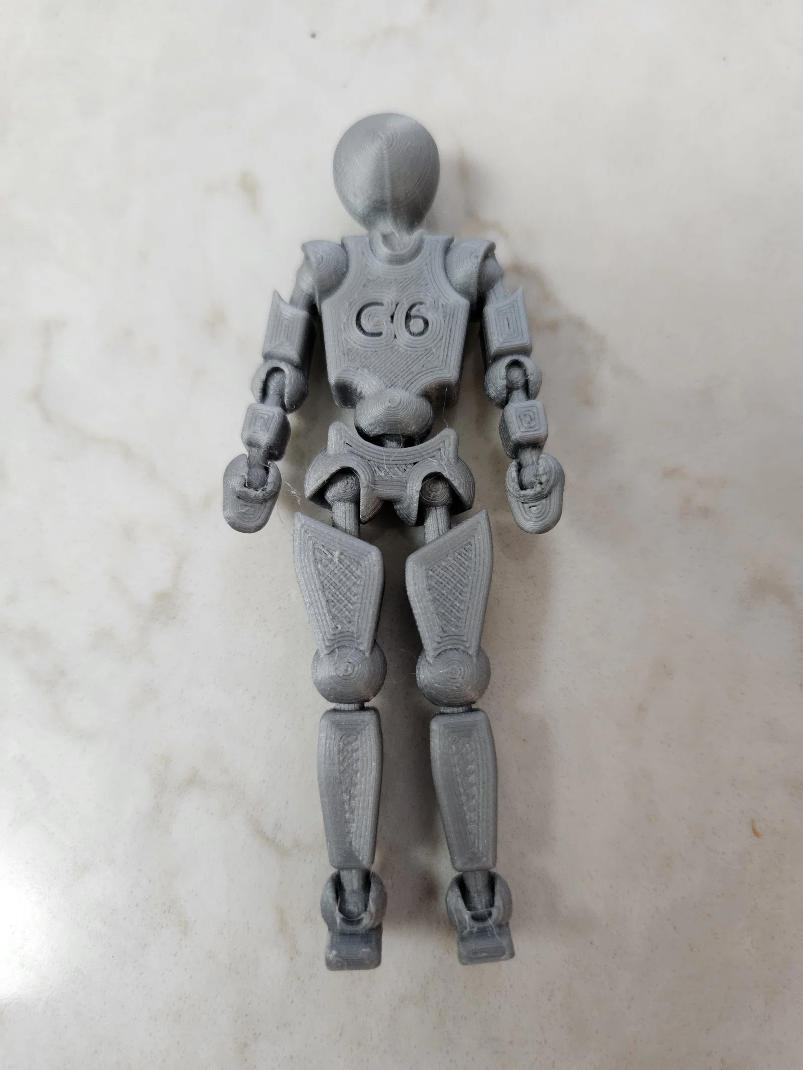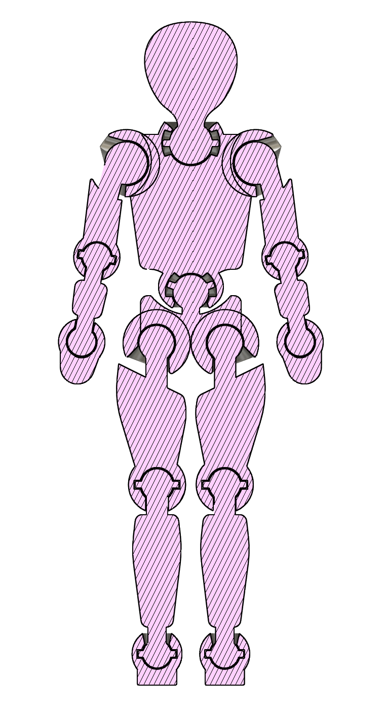 Ngoài ra, ở khuỷu tay, đầu gối, mắt cá, eo và cổ, mình in các chốt (pin) 1 mm kèm các hốc tương ứng để giới hạn góc xoay. (Xem phần phân tích mặt cắt trong các ảnh đính kèm.) Riêng phần hông thì mình không làm ổn được vì biên độ chuyển động cần thiết khiến nó quá lỏng/thiếu ổn định. Mình cũng để vai và cổ tay xoay tự do hoàn toàn, nhưng có thể sẽ quay lại chỉnh sau. (Mọi góp ý đều hoan nghênh.)