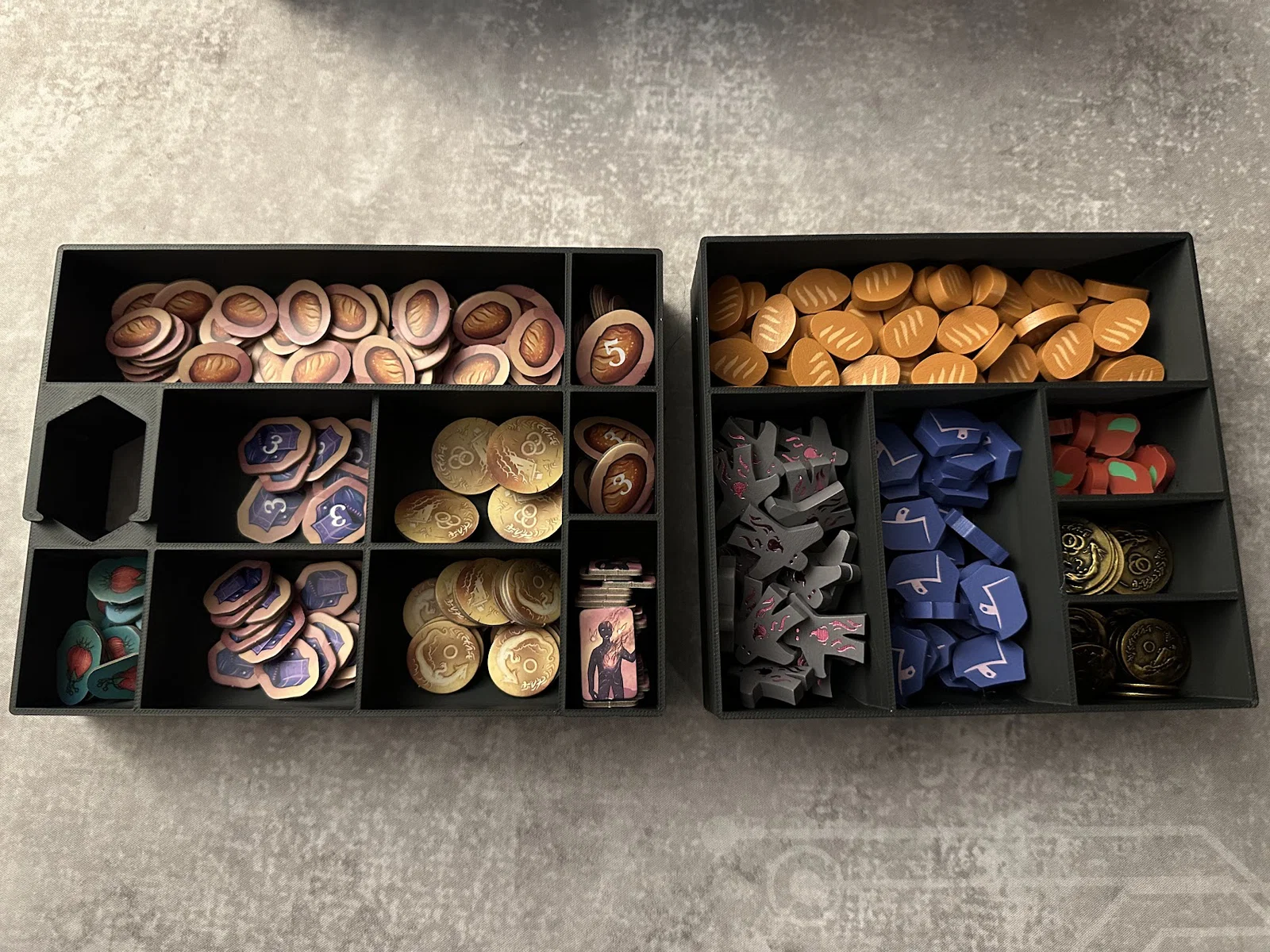 Đây là insert không chính thức cho Creature Caravan Deluxe Edition của Red Raven Games. Có 2 khay giữ bộ bài và 2 khay tài nguyên để lấy dùng cho tiện, đủ chỗ để chứa bài đã bọc sleeve trong khay bộ bài, cũng như tài nguyên bản deluxe + tài nguyên cardboard. Do mình thích dùng BGStats để ghi điểm, nên mình chọn để sổ điểm (score pad) ở đáy hộp, nhưng bạn cũng có thể để nó lên trên các player boards một cách dễ dàng.