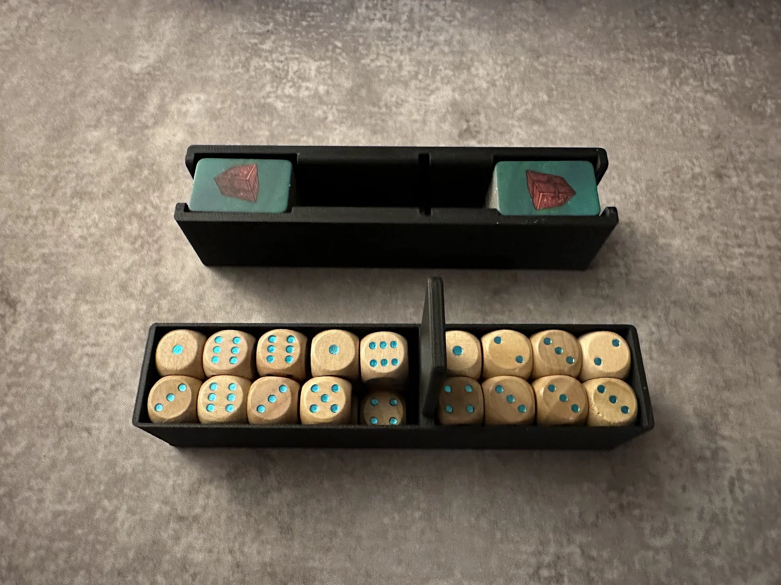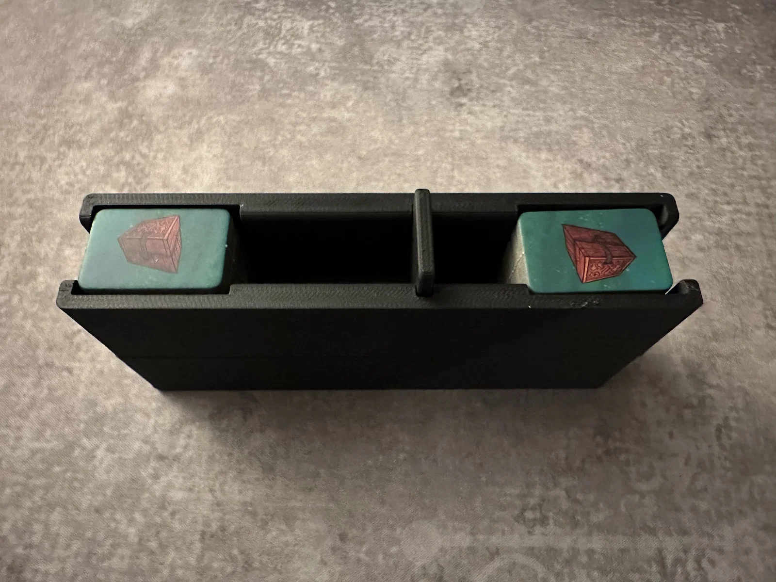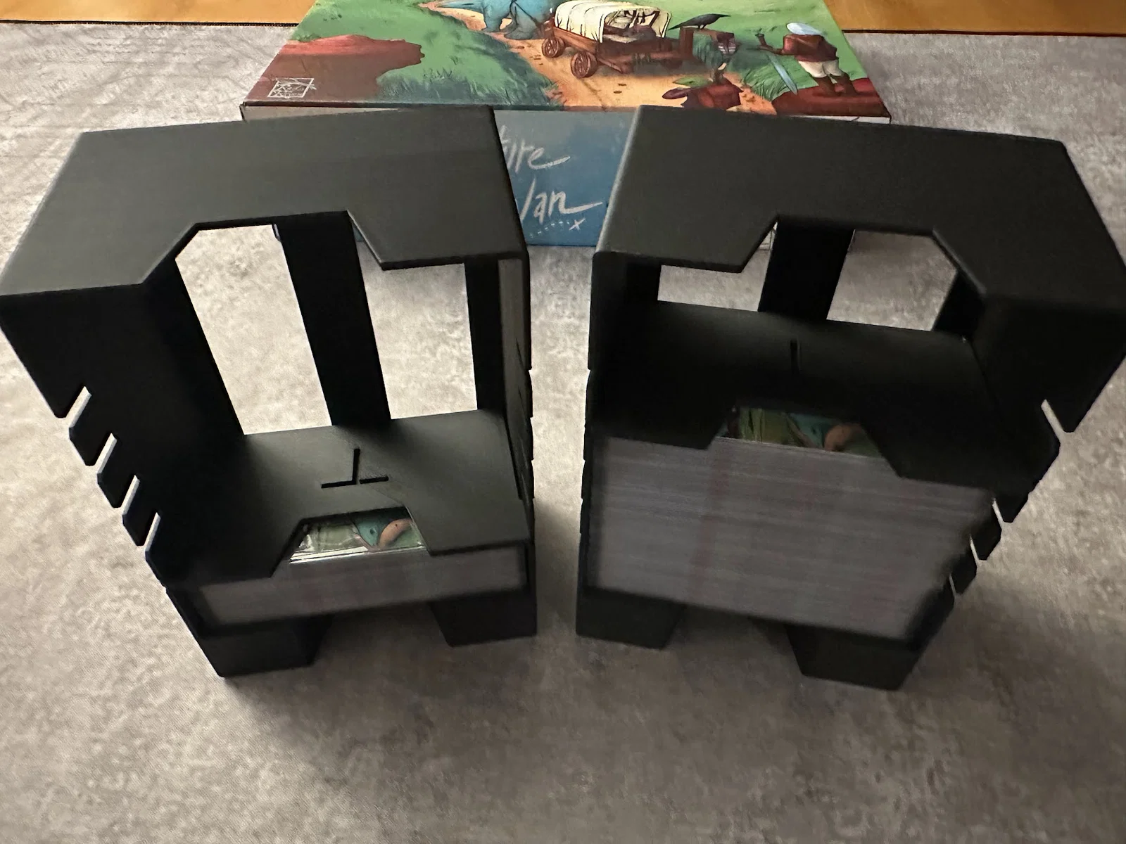 Insert không chính thức cho Creature Caravan Deluxe Edition: 6 khay người chơi, 2 khay giữ bộ bài, khay tài nguyên và divider tùy chọn. Vừa bài có bọc sleeve, hỗ trợ cất dọc không đội nắp; in 0.4 nozzle, layer 0.2, infill 15%.