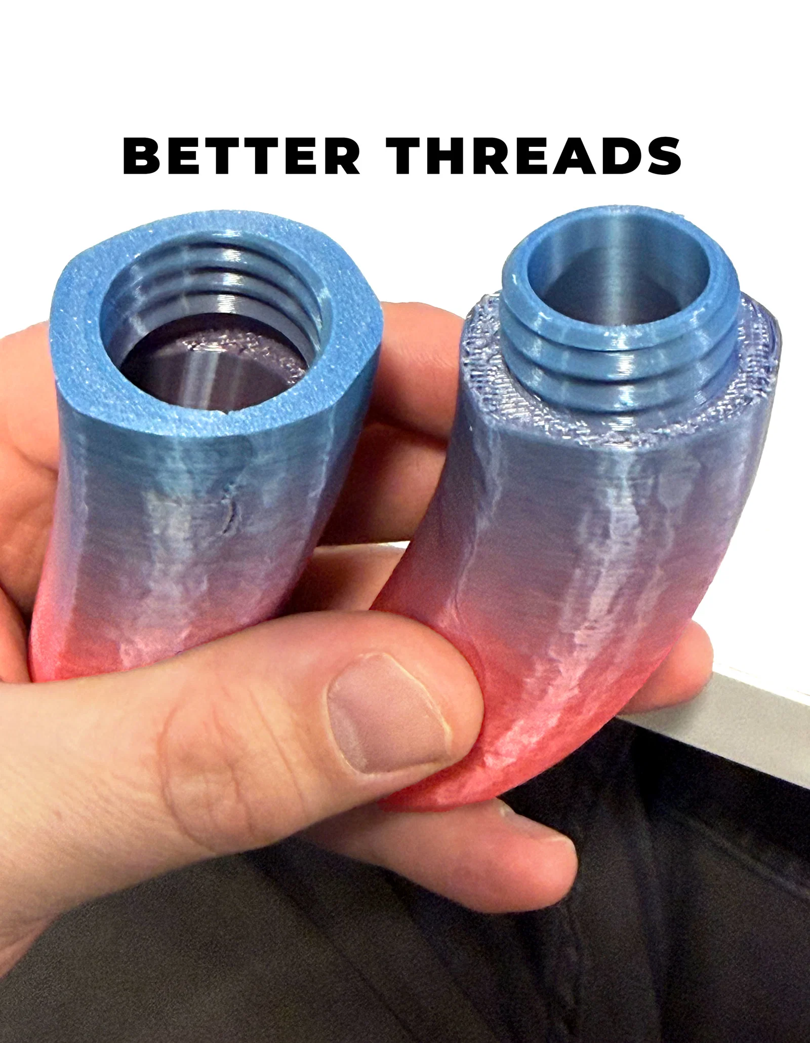 Phần ren (threads) lúc mới in xong còn khá khít ngay từ trên bàn in, nên bạn sẽ phải vặn tới vặn lui vài lần cho tới khi nó vặn kín hoàn toàn. Xong rồi thì về sau dùng sẽ trơn tru ổn định hơn!