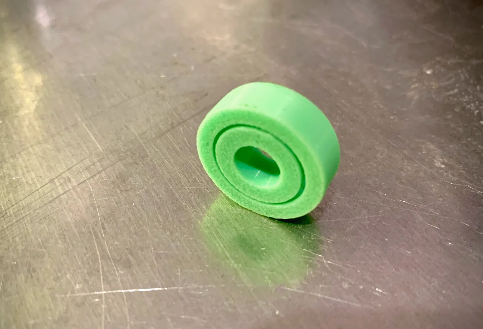 Vòng bi 608 in thành nhiều mảnh rồi snap-together, in nhanh, dung sai chặt và ma sát thấp. Dễ tra mỡ, ít rơ dọc trục và rơ hướng kính dưới 0.3 mm (tốt hơn nhiều so với print-in-place).