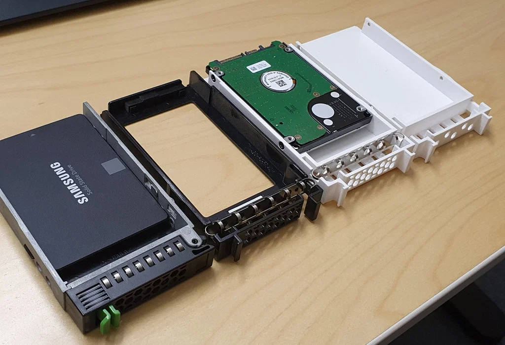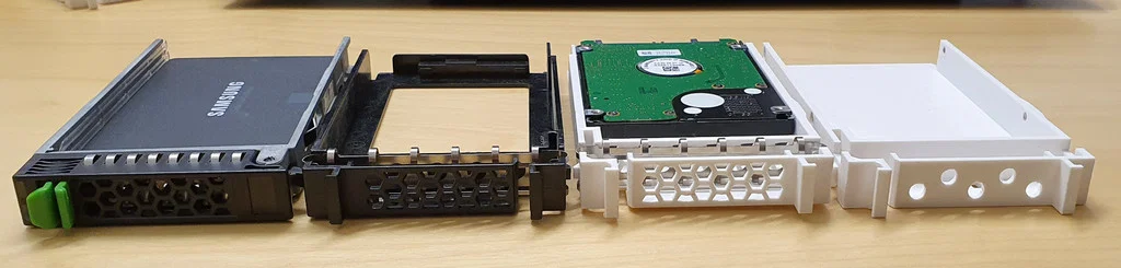 Khay hotswap 2.5" HDD/SSD cho server Fujitsu Primergy đời cũ, thay thế A3C40058356. Hỗ trợ ổ dày tới 12.5mm, có lỗ thoáng gió và lỗ vít countersink; kèm bản “minimal” cho ổ cao hơn.