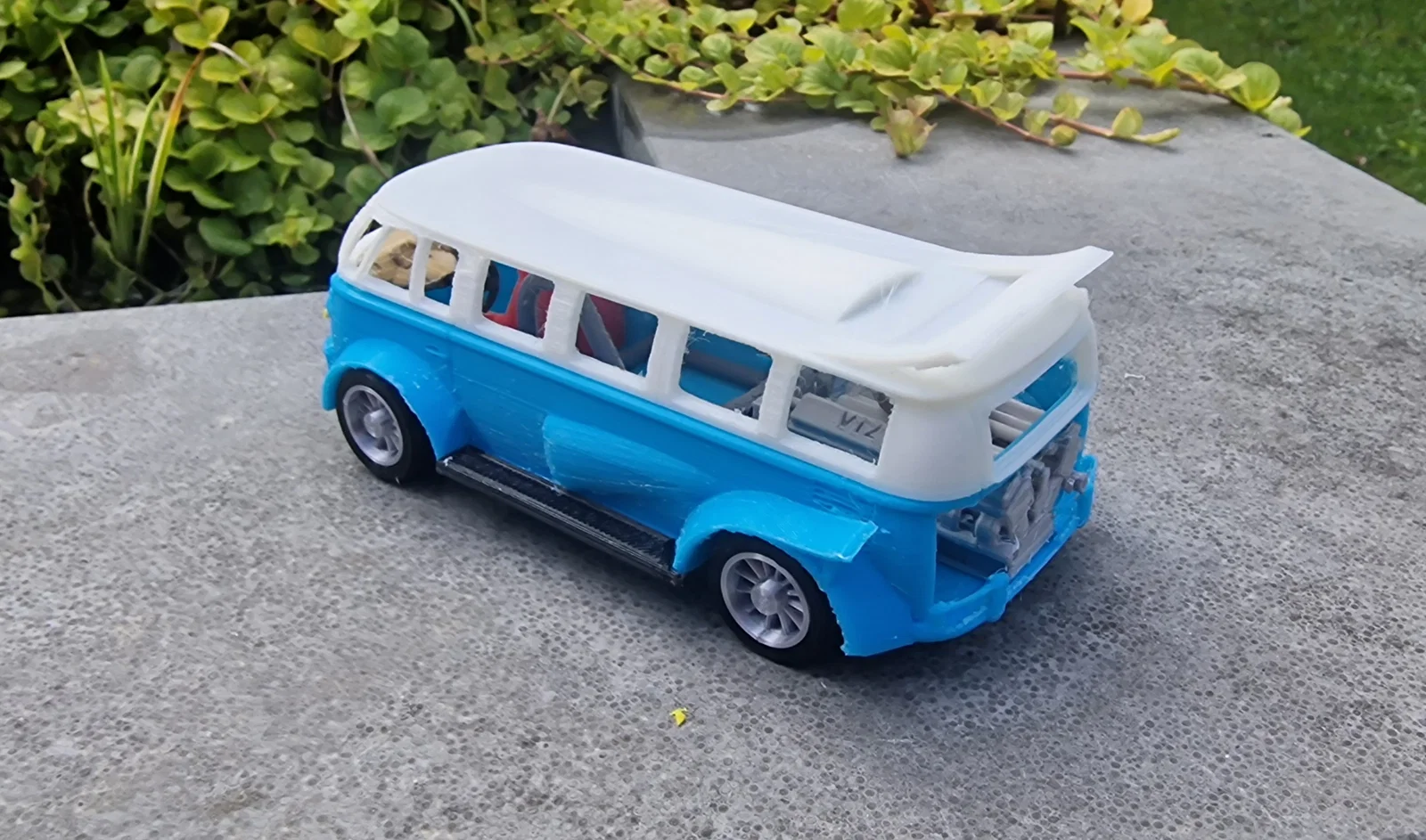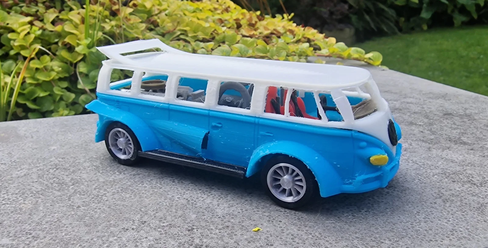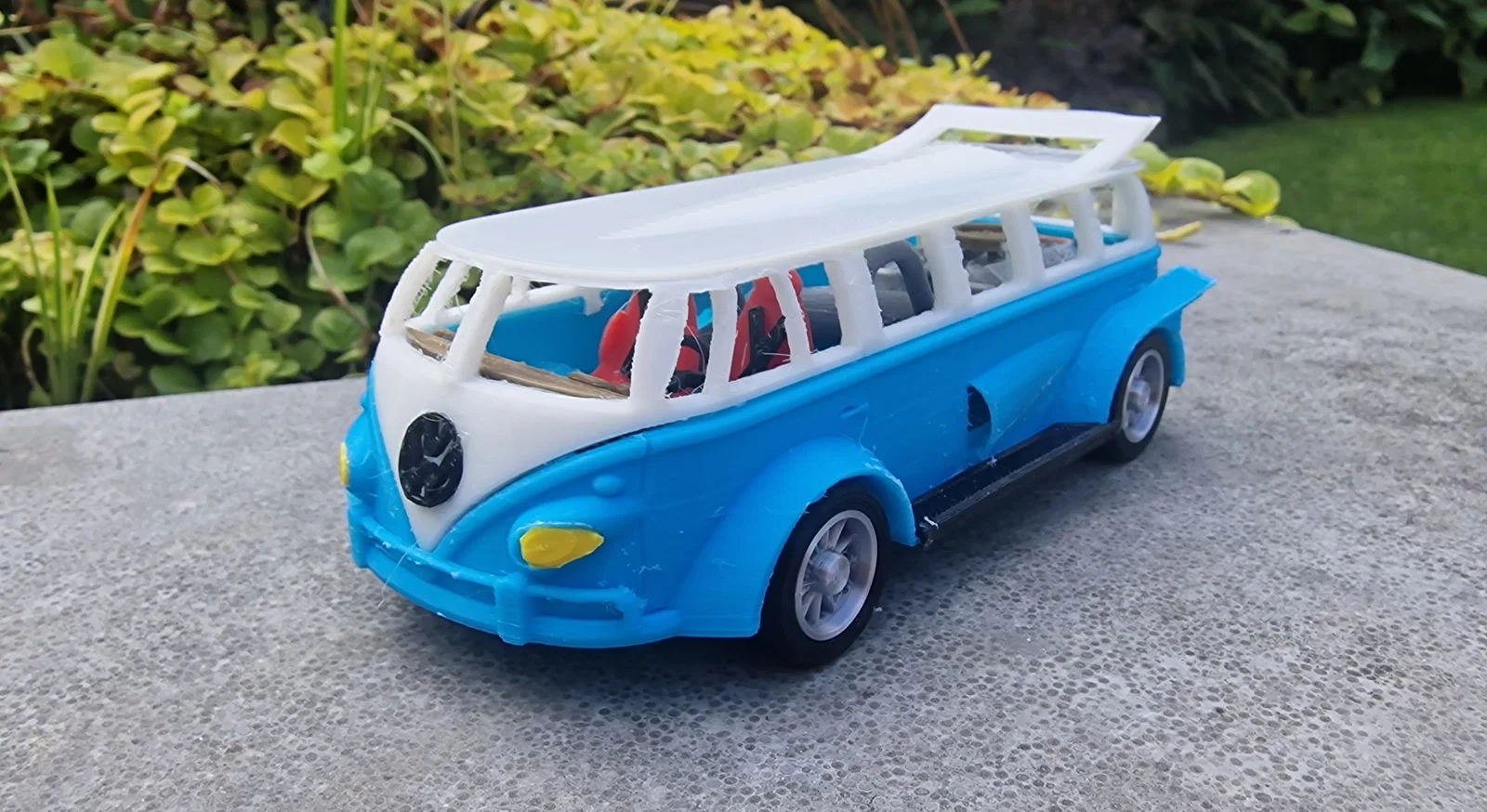 Điểm ấn tượng nhất của mô hình này chính là sự kết hợp giữa kiểu dáng cổ điển đặc trưng của dòng xe van và các yếu tố khí động học mạnh mẽ. Phần thân xe được thiết kế chi tiết với ghế ngồi thể thao bên trong, khung xe cứng cáp và các điểm nhấn nổi bật, tạo nên một tổng thể vừa hoài cổ vừa hiện đại. Việc in 3D mẫu xe này không chỉ mang lại cho bạn một vật phẩm trang trí thú vị mà còn là cơ hội để thử nghiệm kỹ năng phối màu nhựa và độ hoàn thiện bề mặt.