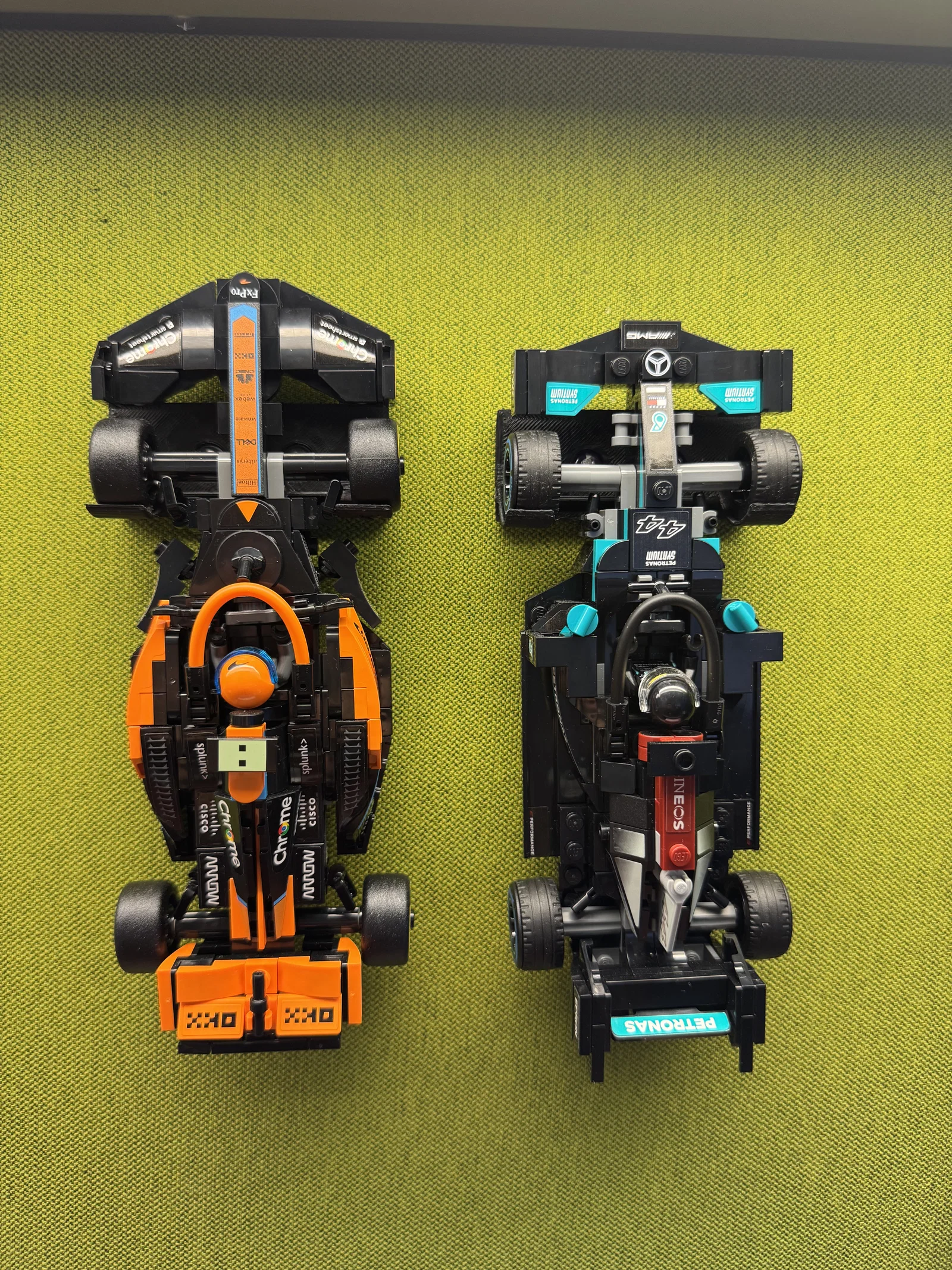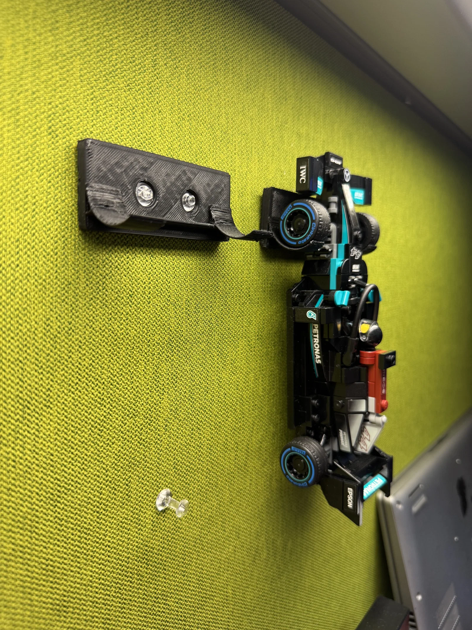 Giá treo dọc cho xe Lego Speed Champion. In một lần là xong, bật supports khi in. Có thể cắt phần đầu của cây ghim (tack) đi để khi gắn vào thì nằm phẳng, nhìn gọn hơn. Với một số mẫu xe, sẽ vừa hơn nếu bạn dừng in trước khi phần giữ bánh xe được hoàn thiện hoàn toàn.