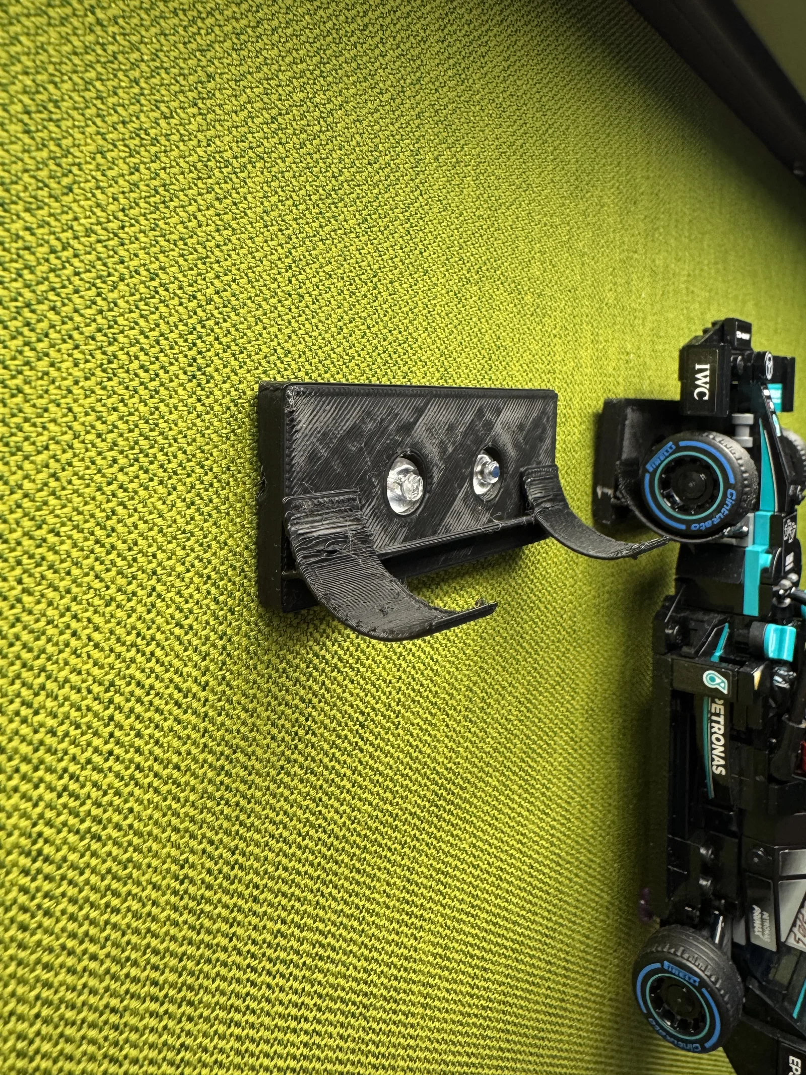 Giá treo dọc (vertical mount) cho xe Lego Speed Champion, thiết kế in một lần, cần bật supports. Có thể cắt đầu ghim để lắp phẳng; vài mẫu sẽ vừa hơn nếu dừng in sớm trước khi xong phần giữ bánh.