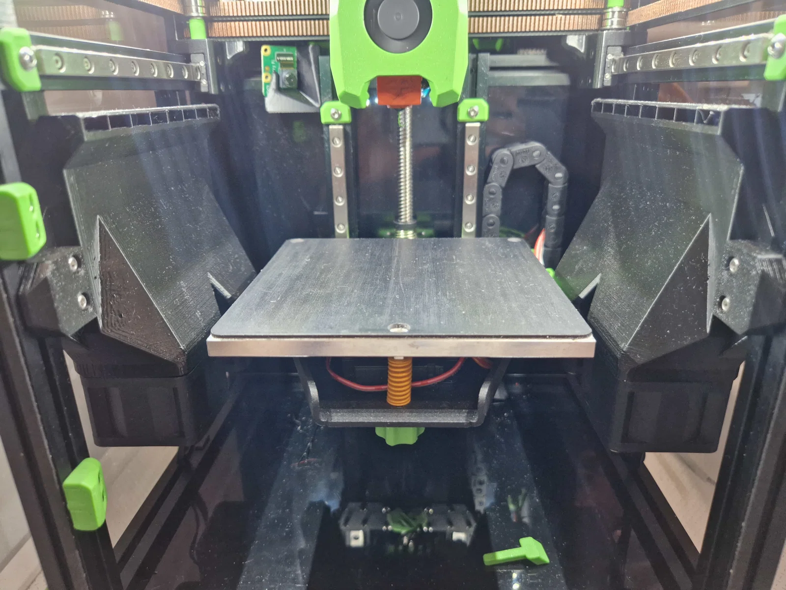 Giữ một lớp luồng gió mỏng và đều thổi ngay bên dưới nozzle. Có thể dùng để làm ấm chamber khi bed đang nóng (đóng cửa trước và đóng tophat), hoặc để làm nguội bed (mở cửa trước và mở tophat).