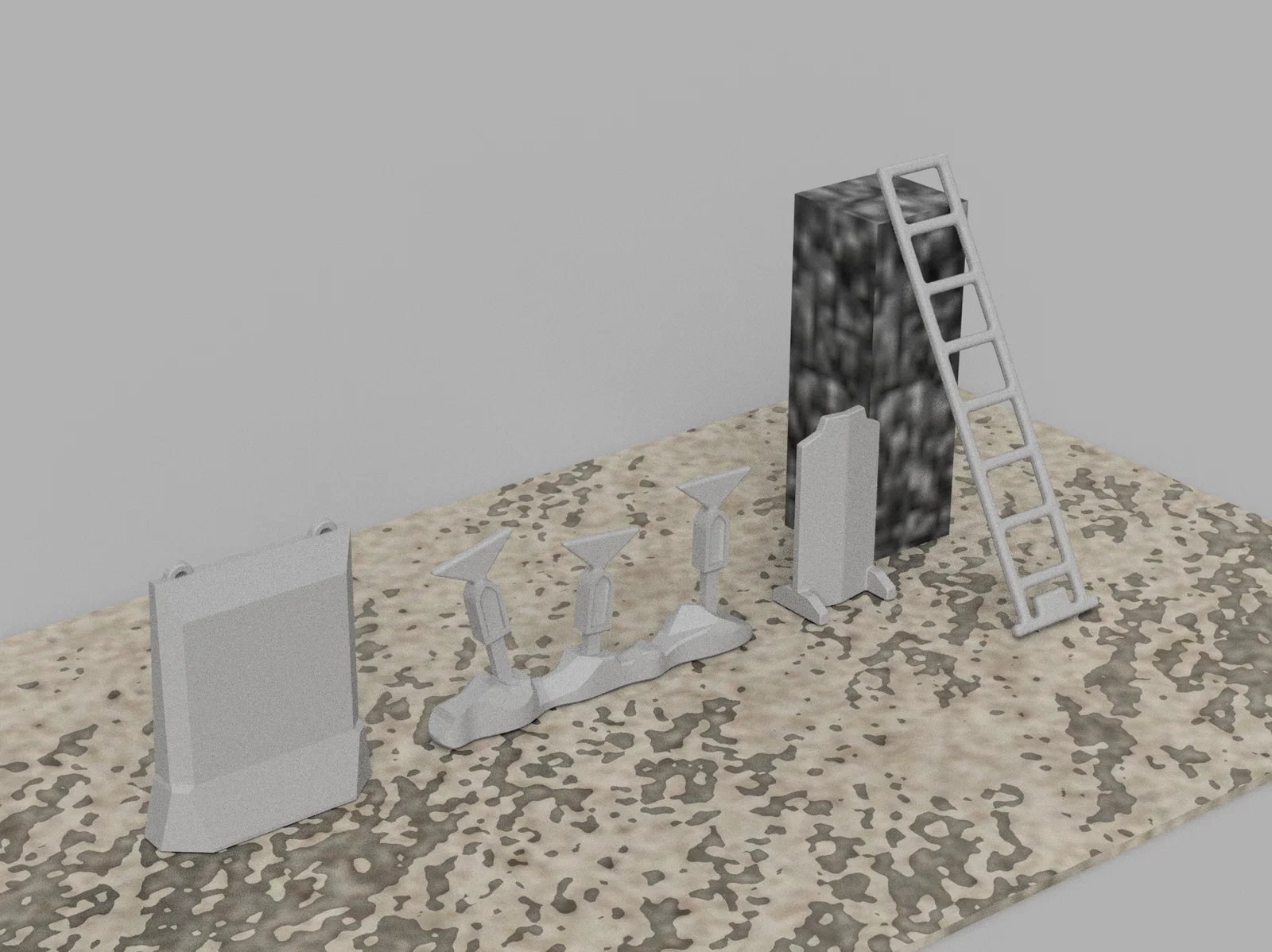 Bộ mô hình bao gồm nhiều chi tiết quan trọng như các thẻ đánh dấu mục tiêu, thang leo, các loại rào chắn và chướng ngại vật. Các file được tinh chỉnh dựa trên hình ảnh thực tế để đảm bảo tỷ lệ tương đối phù hợp cho các trận chiến căng thẳng. Ngoài ra, tác giả cũng cung cấp thêm các bản PDF để in trên giấy nếu anh em muốn có thêm các tùy chọn đánh dấu nhanh hoặc làm hàng rào kẽm gai bằng cách thủ công, giúp tối ưu hóa bàn chơi một cách linh hoạt nhất.