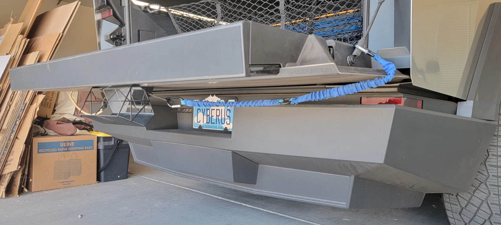 Luồn dây bungee qua lỗ dài và gắn carabiner hoặc đồ tương tự để móc vào dây đai của tailgate.