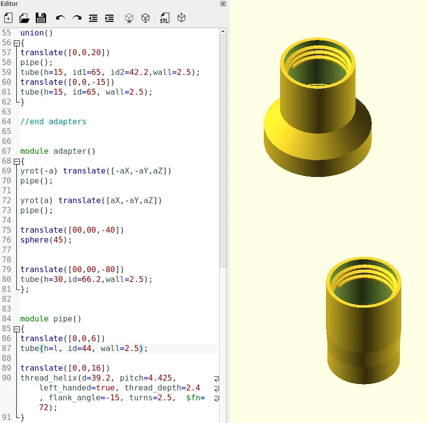 Nếu bạn dùng loại ống khác thì chỉnh lại ren chắc cũng dễ. Tìm BOSL2 Wiki rồi xem mục threaded_helix