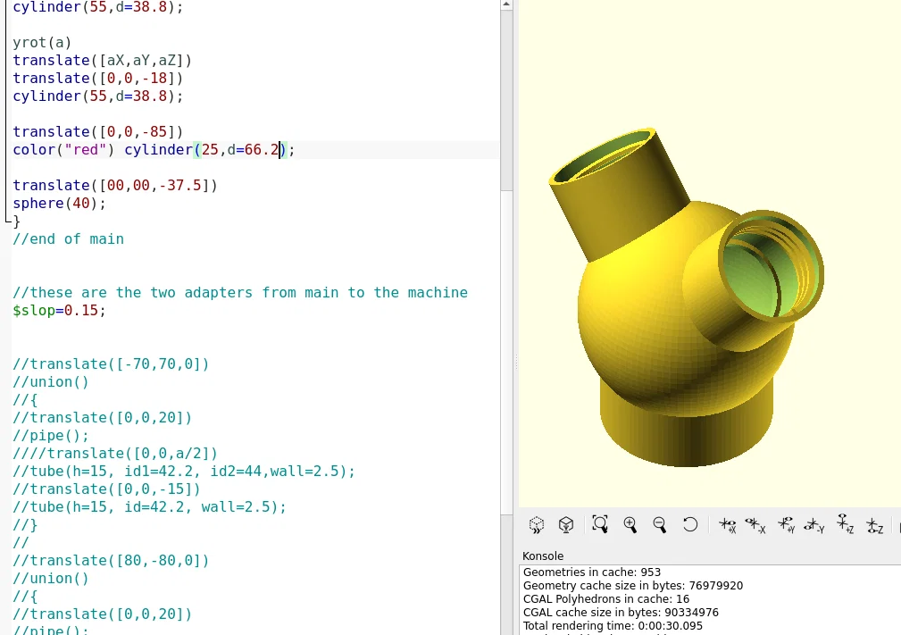 Y-Adapter cho máy cưa bàn DeWalt 7492 để gom bụi. Dùng ống hút bụi tiêu chuẩn; ren trái (left-handed) ước lượng nhưng vừa ngay lần đầu. Có thể chỉnh ren cho ống khác; tham khảo BOSL2 Wiki mục threaded_helix.