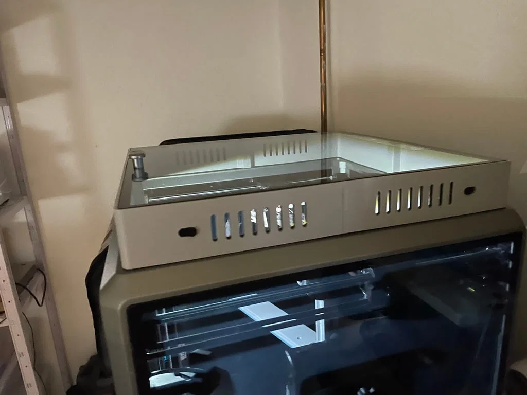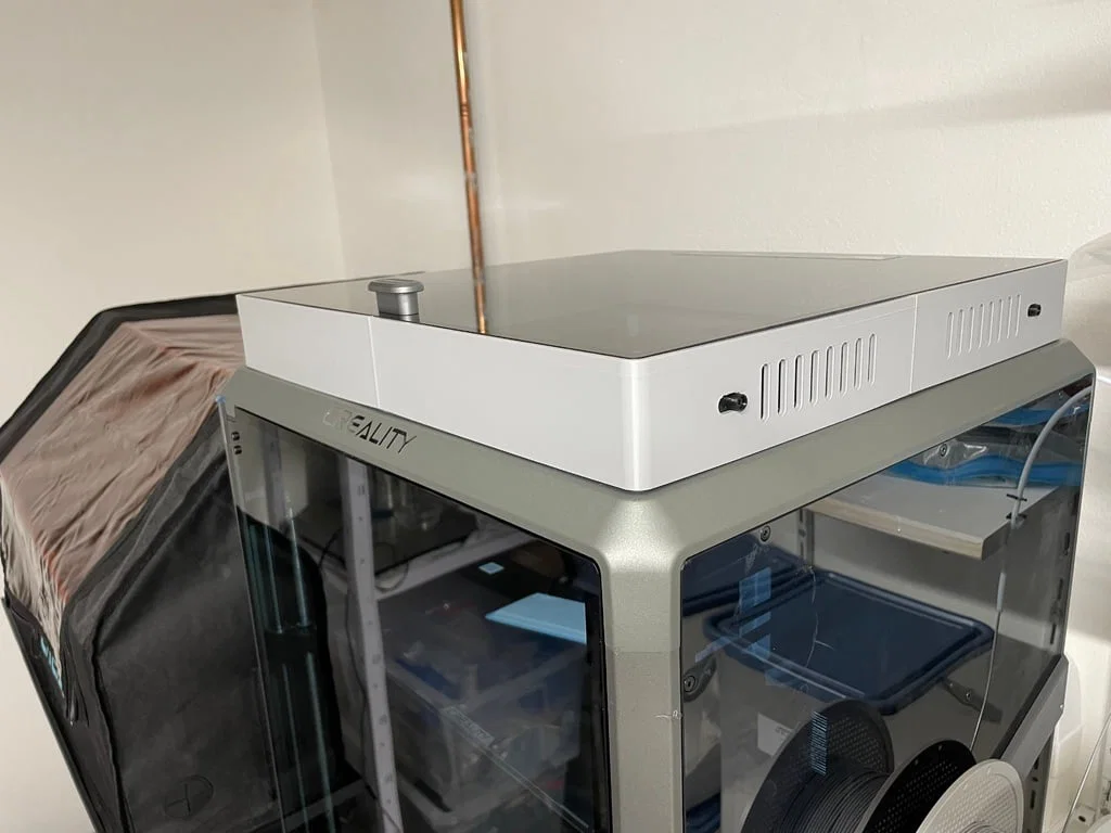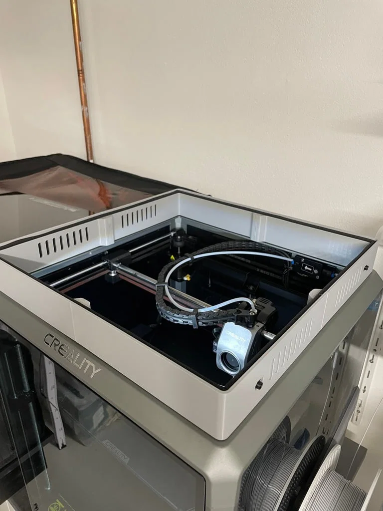 Phần mở rộng đơn giản cho nắp kính Creality K1 Max, in 4 đoạn rồi ghép vào nhau. Có khe thông gió đóng/mở, nút trượt bắt bằng ốc M3, dán gioăng mút dày 3 mm. Kèm file Fusion 360 để tùy chỉnh.