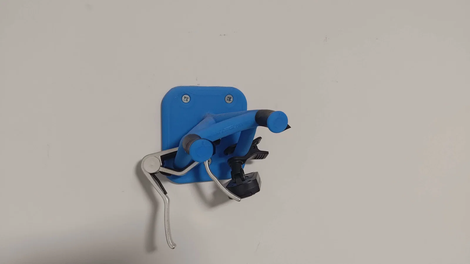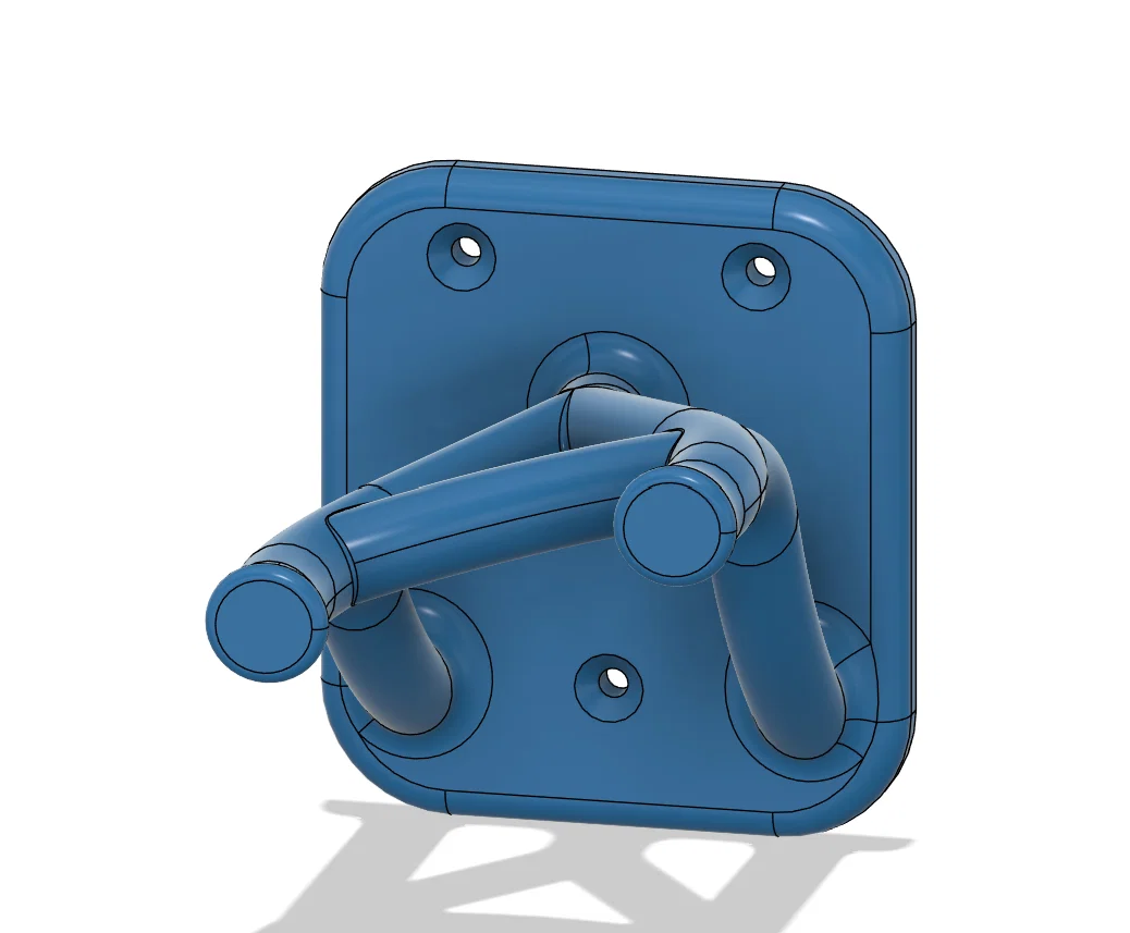Giá treo tường cho electric guitar, phù hợp cần kiểu strat nut 42mm. Thiết kế wireframe cứng cáp, dùng vít countersunk ~4mm (lỗ trên cách 45mm, lỗ dưới thấp 65mm). Khuyên bọc băng keo/ống co nhiệt để bảo vệ sơn.