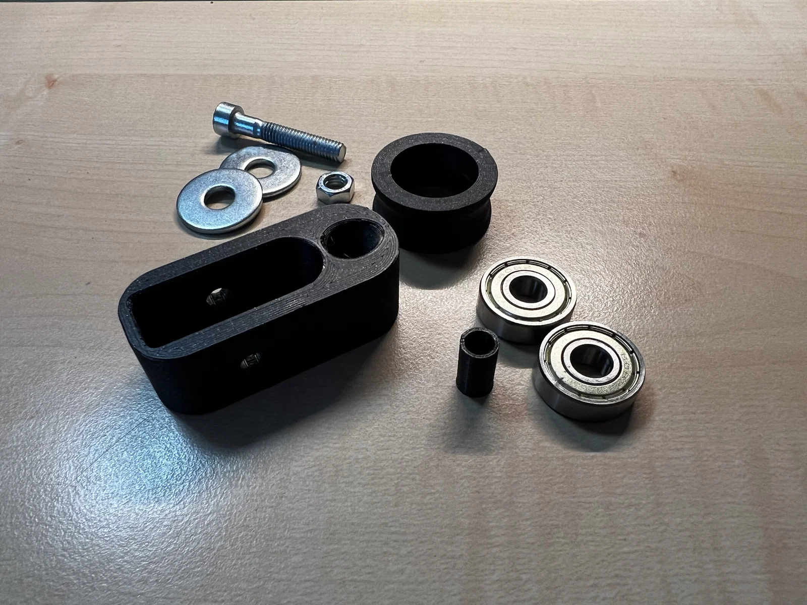 Để lắp ráp cần: 2 vòng bi 608 ZZ, 1 vít M6 x 35, 2 long đền phù hợp (ưu tiên ISO 7093) và 1 ê-cu M6.