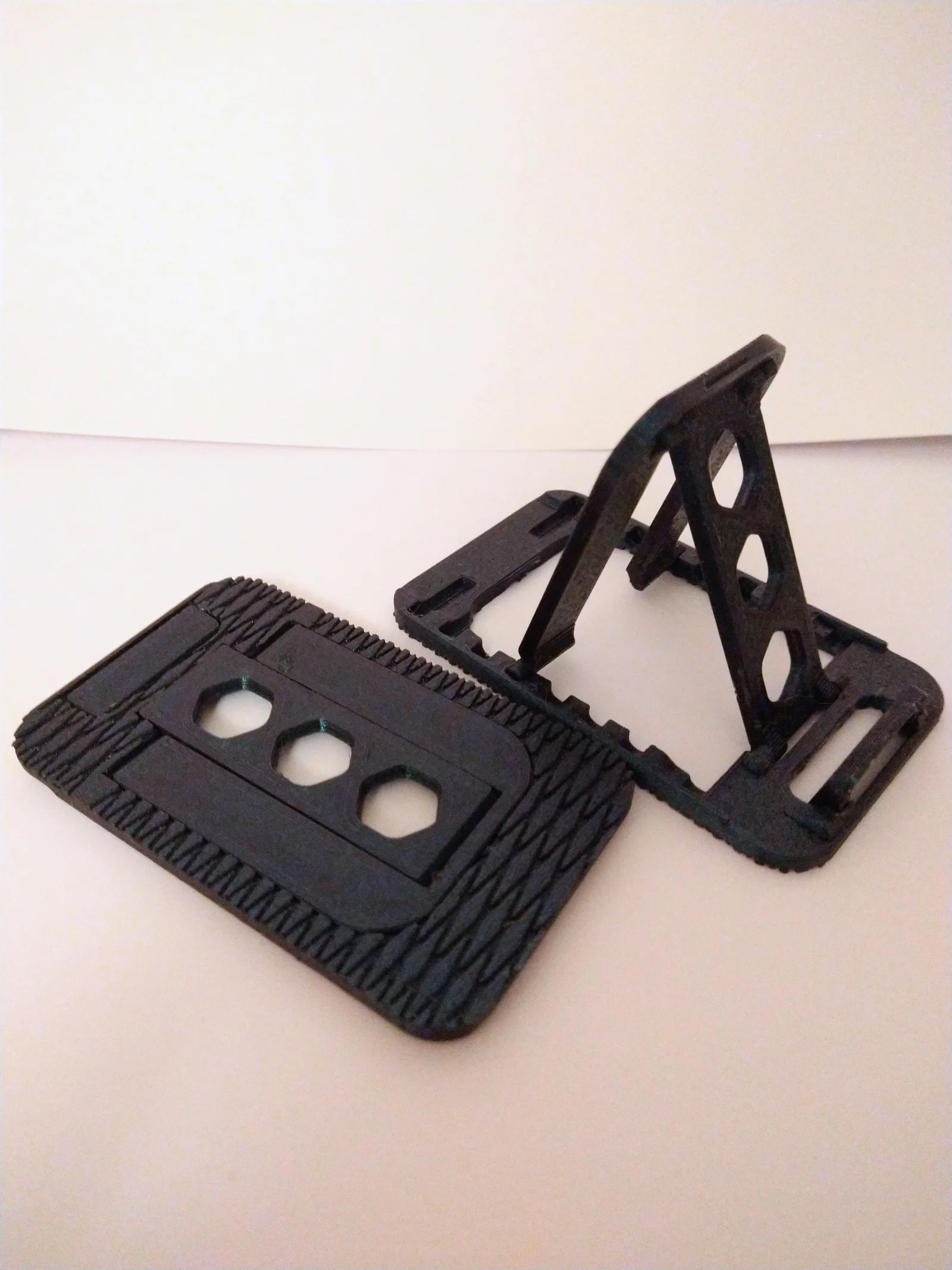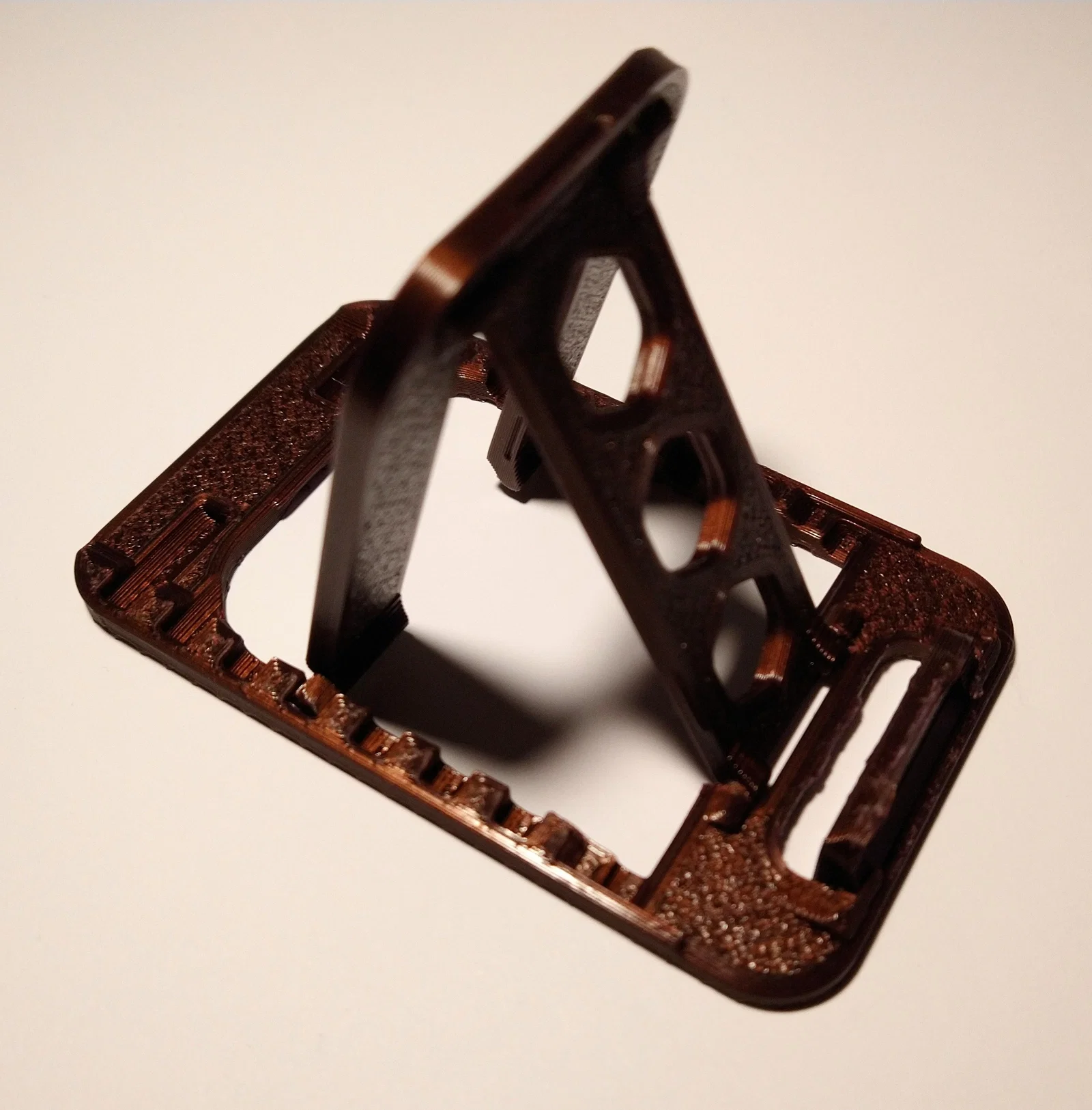 Bản remix chân đỡ điện thoại/tablet cứng cáp hơn, rãnh sâu và dày hơn để hạn chế tuột khỏi khớp. Có texture đáy chống trượt. Print in place, in tốt với PLA, 0.28mm layer, nozzle 0.4mm.