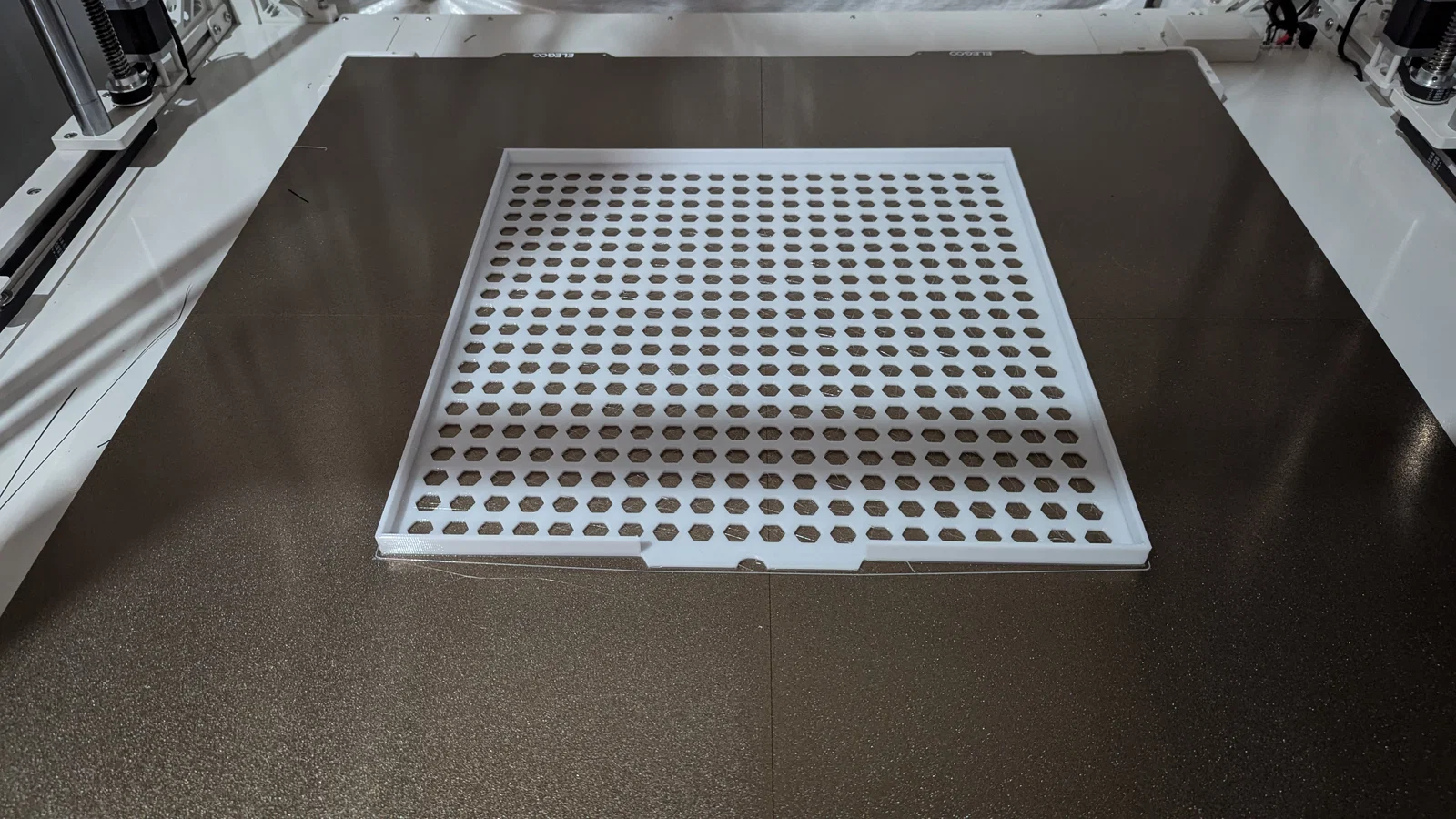 - Lưu ý vận hành: Đảm bảo bàn in đã được cân chỉnh kỹ trước khi in khay này vì kích thước của khay khá lớn, cần sự bám dính tốt trên bề mặt bàn in.