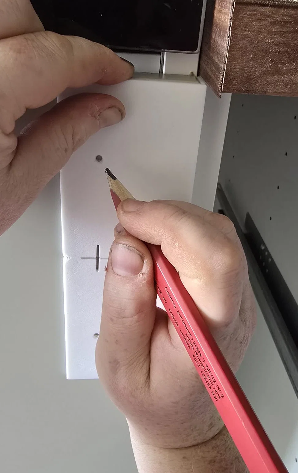 Mình có làm một cái schablone / template giúp khỏi phải canh vẽ dấu lỉnh kỉnh khi lắp tay nắm cửa IKEA Bagganäs. Chỉ cần áp cái schablone vào bất kỳ góc nào của cánh tủ, hoặc canh giữa trên mặt ngăn kéo rồi đánh dấu.